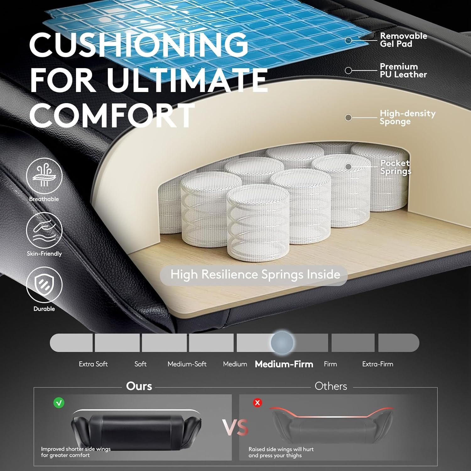 Ultimate Comfort & Ergonomic Support: Experience sofa-like comfort with a thick seat cushion featuring high-density foam and elastic pocket springs that evenly distribute body pressure. The shorter side wings accommodate a wider range of body shapes while ensuring thigh comfort. The contoured backrest supports the natural curve of your spine, while the adjustable massage lumbar pillow and headrest help relieve back and neck strain. Breathable materials keep you cool and comfortable even during long sessions.