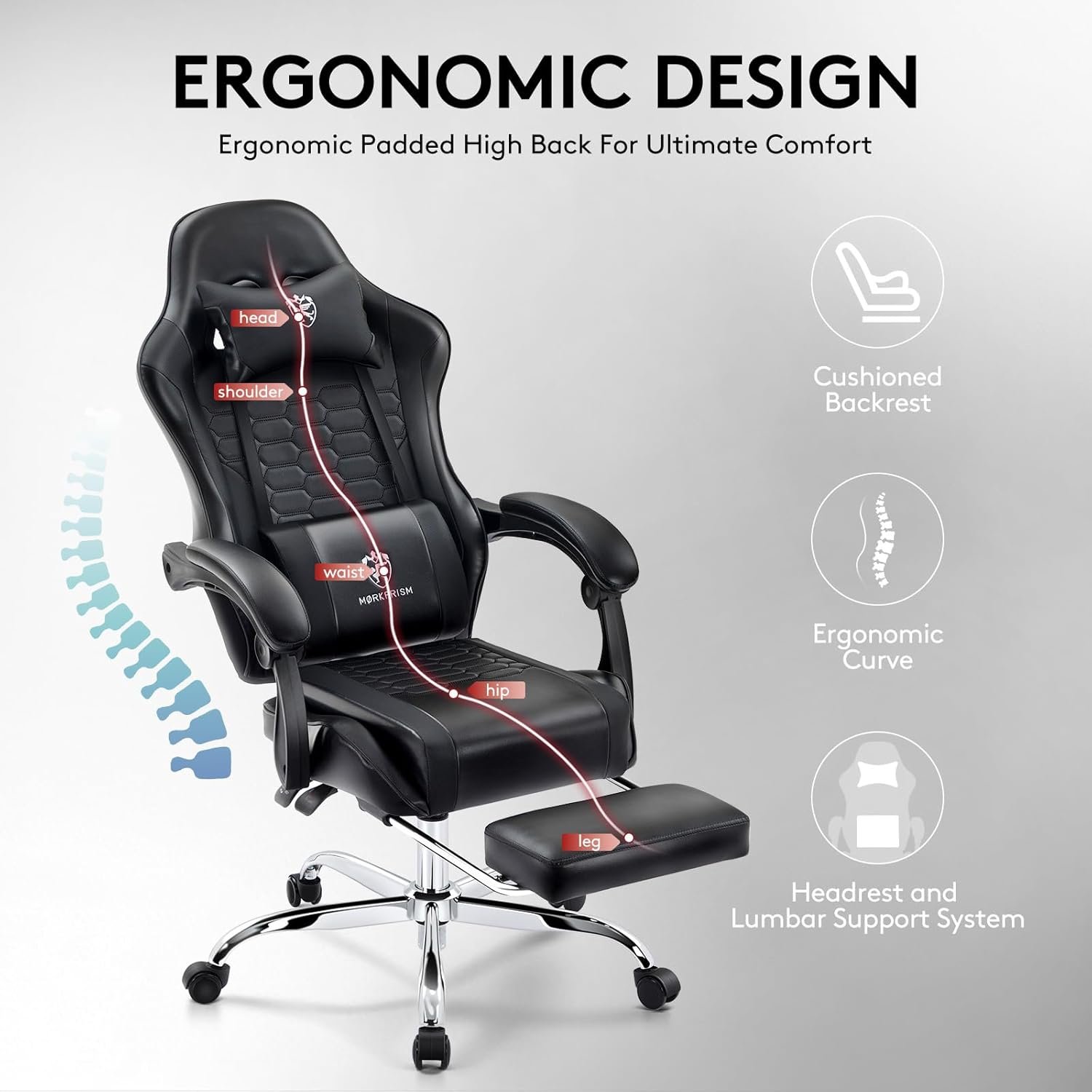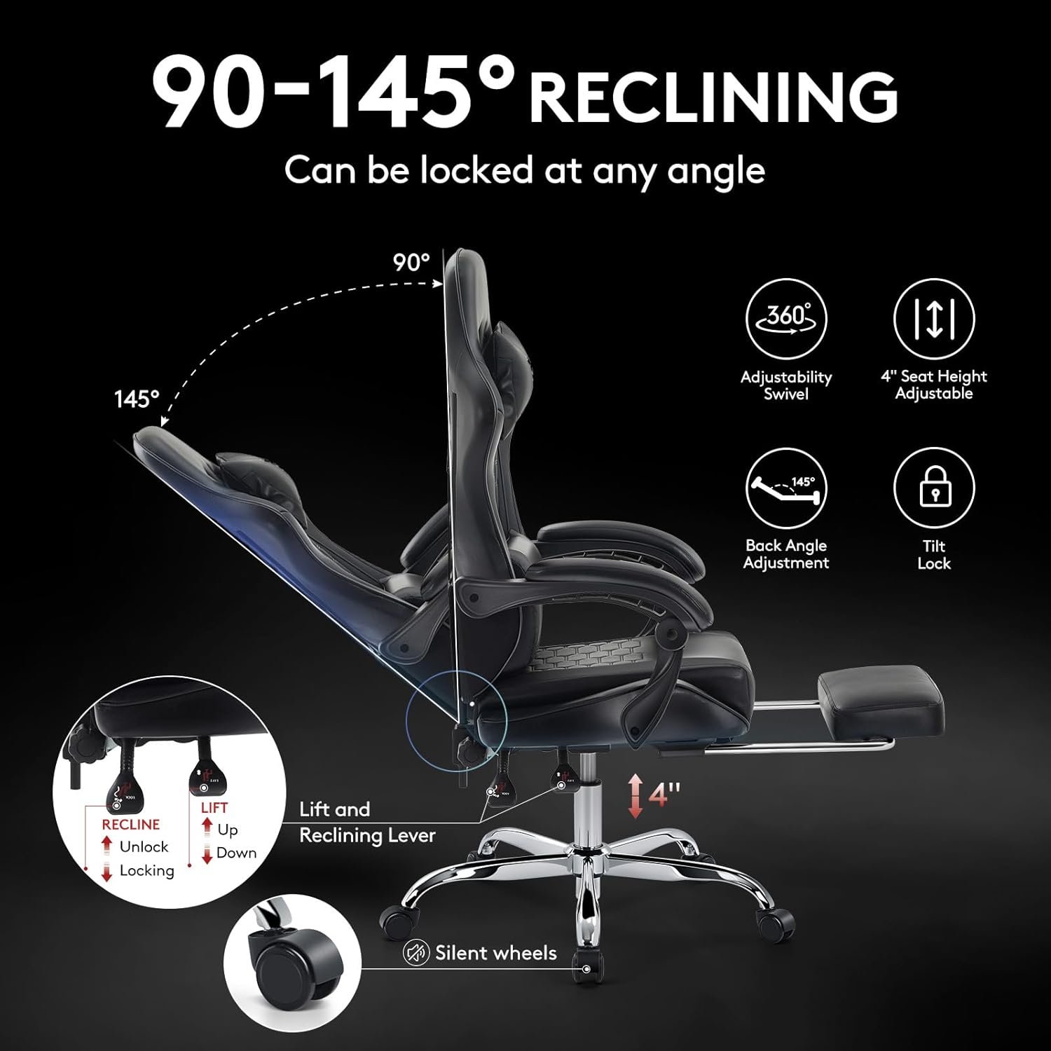 Multifunctional Design: Perfect for both gaming and office use. With a 90°-145° recline range, retractable footrest (allows for cross-legged sitting), 4-inch height adjustment,360° swivel, and smooth-rolling silent wheels, this chair makes it easy to transition between work, gameplay, and rest.