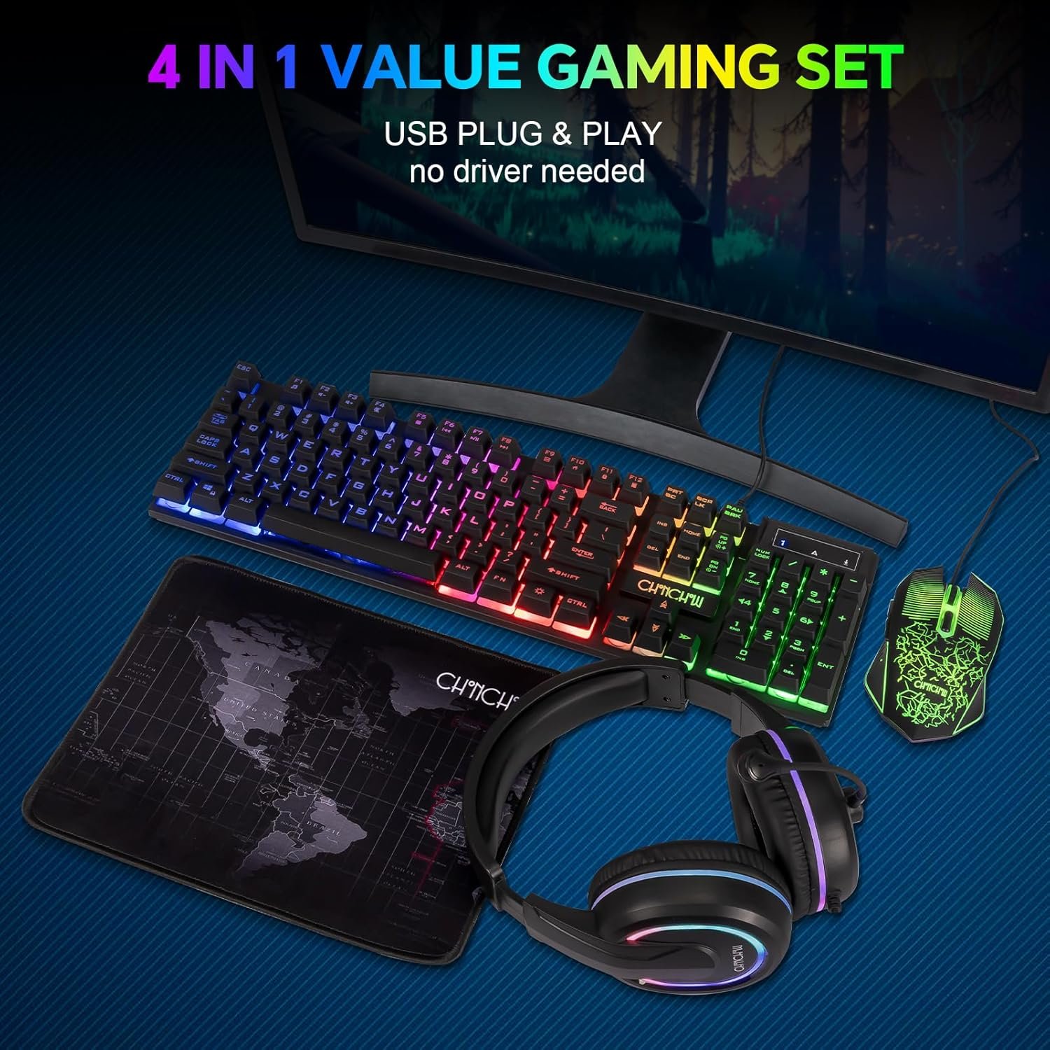 【Gaming Bundle】Package includes gaming keyboard and mouse , gaming headset and mouse pad; Plug & Play, No driver need.Its beautiful packaging makes it better