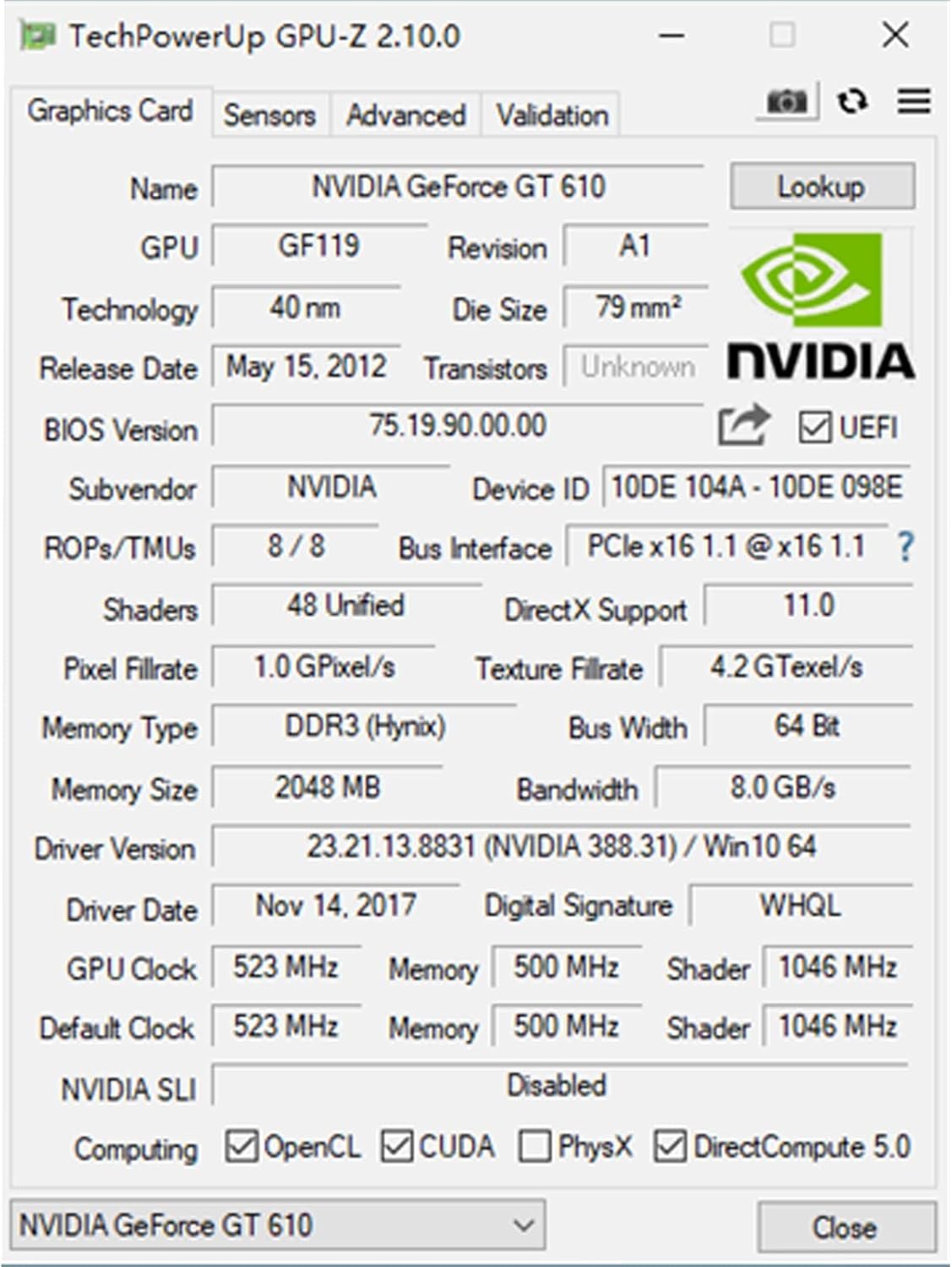 NVIDIA GeForce GT 610 2GB DDR3 64 Bit PCI Express 1.1 x 16 Low Profile Video Card