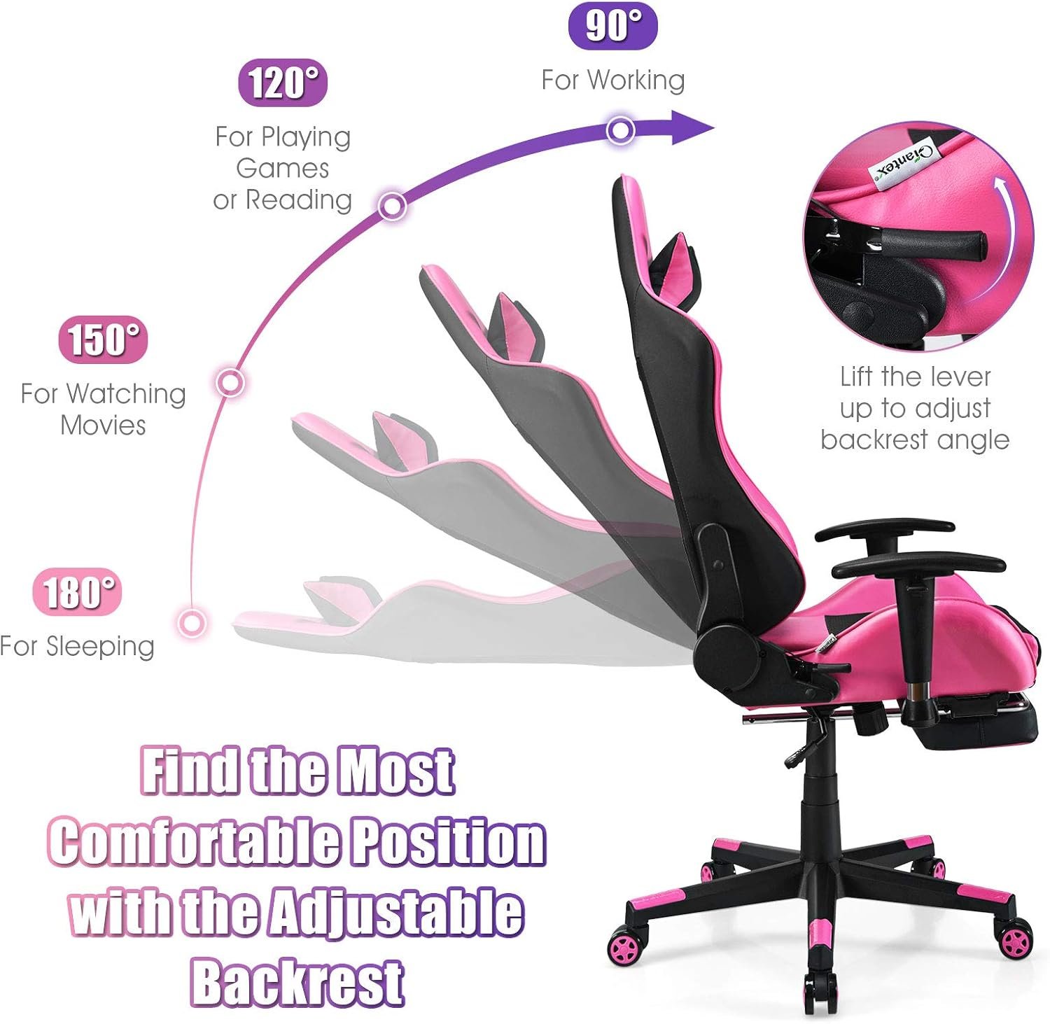 Sitting and Lying Double Use: The back of this racing chair can be extended at 180 degrees, so you can adjust it to your desired comfortable angle. The chair also has one considerable foldable feet shelf, which gives your legs support when you sleep on the chair. And it can be conveniently retracted on working and playing modes.