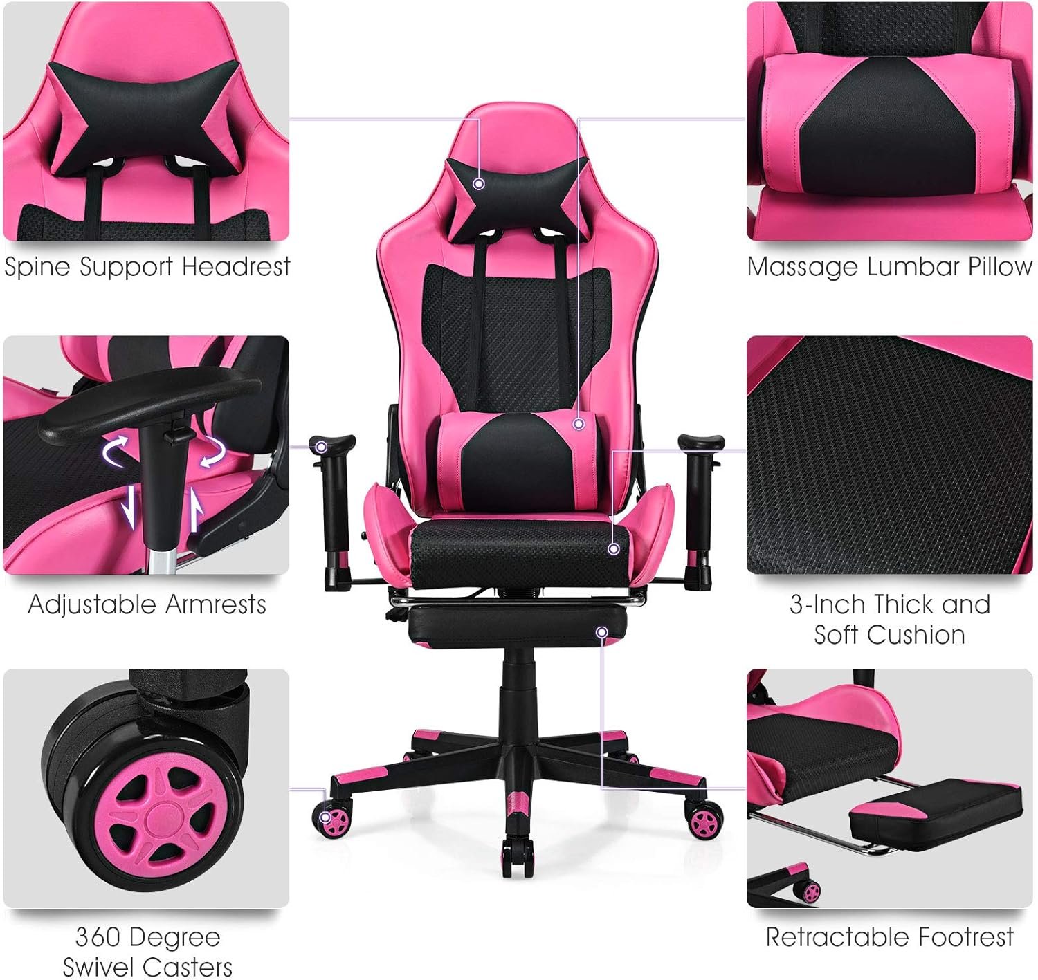 Soft Headrest and USB Massage Waist Cushion: The curvature of the back of the chair conforms to ergonomic design and will give you the same comfort as in a cradle. The pillow and waist cushion on the chair will support your neck and waist perfectly. In addition, our waist cushion also has massage function. You only need to connect the USB to the power supply to relieve your waist fatigue when you sit for a long time.