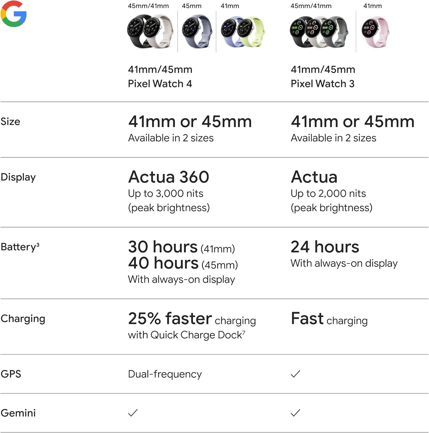Meet the Google Pixel Watch 4, an exceptional smartwatch engineered by Google with precision craftsmanship.[2] It’s built to last, from a first-of-its-kind Actua 360 domed display to Google’s longest battery life and fastest charging yet.[1,3,7,22] And it packs helpful AI, powerful health and fitness tools, and safety features to give you peace of mind.[4]
