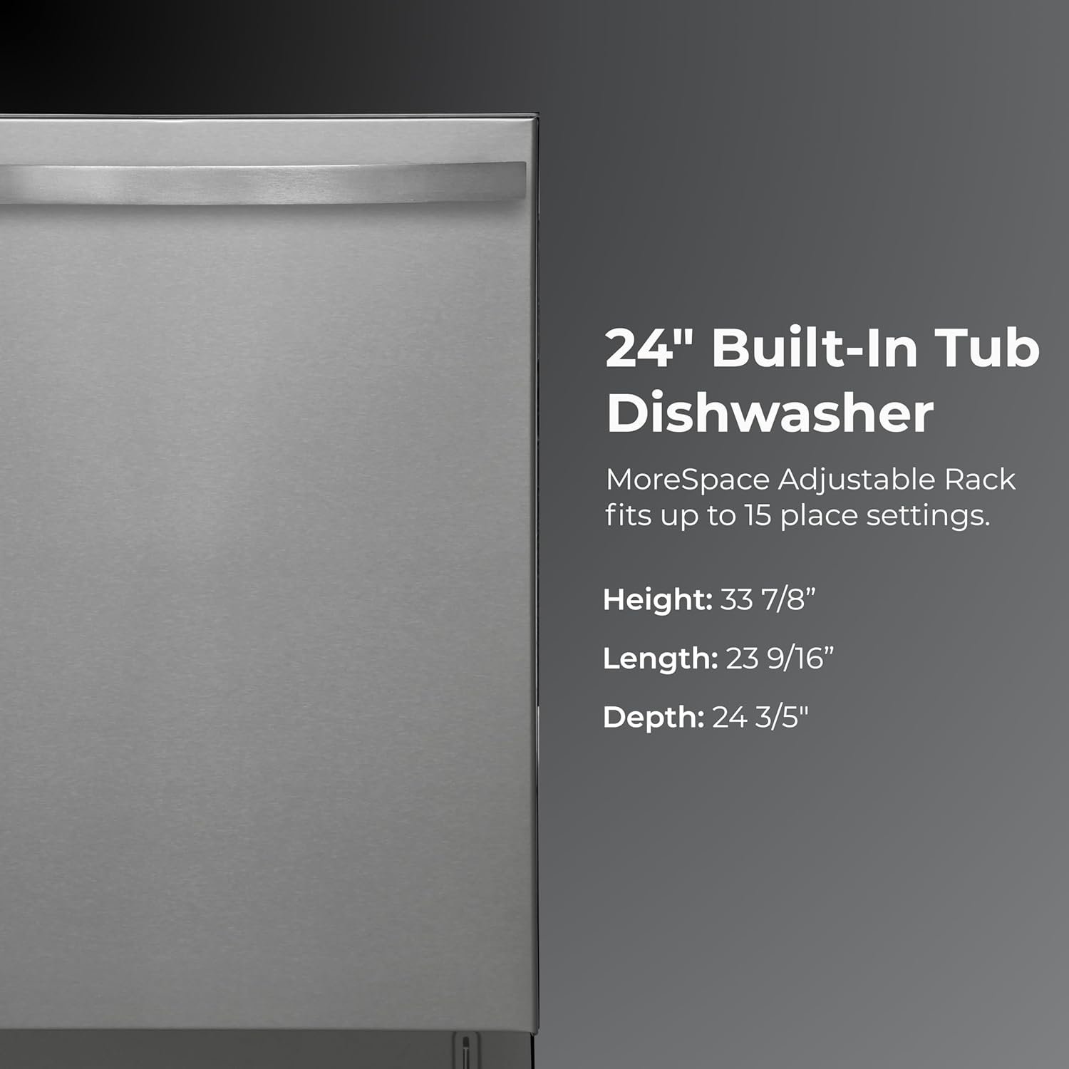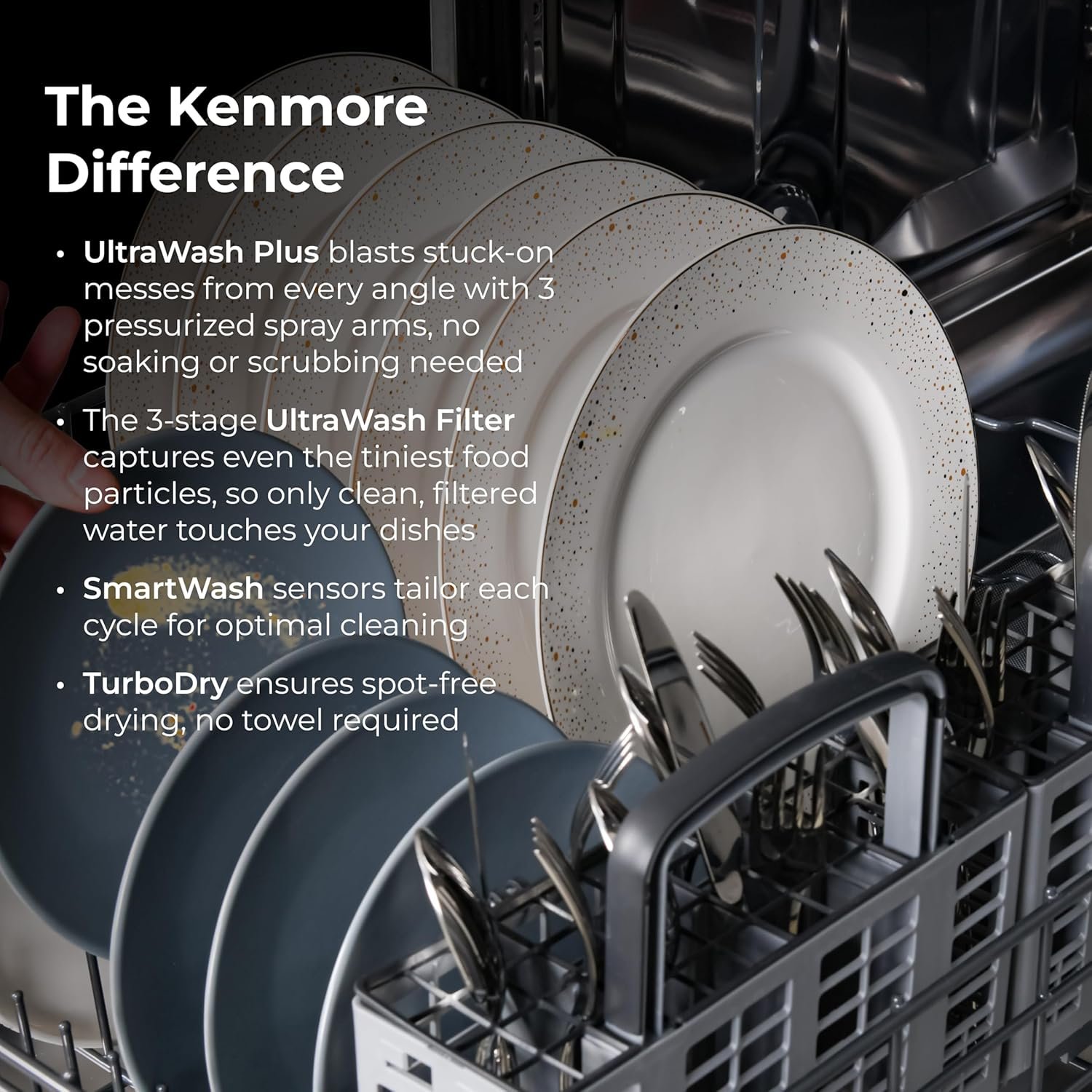 Elevate your clean and your kitchen with the Kenmore 24″ Built-In Dishwasher. UltraWash Plus uses three pressurized spray arms and filtered water to clean dishes from every angle. The SmartWash Cycle detects how dirty the water is and adjusts the temperature, pressure, and cycle time to match, so every load gets a custom clean. TurboDry uses a built-in fan and heating element to pull moisture from the tub, helping even plastic containers come out dry and ready to put away. For extra flexibility, the EasyFlex Third Rack adds 35 percent more space for long utensils and tools, and can be removed when you need extra room in the rack below. The MoreSpace Adjustable Rack makes it easy to fit tall or awkward items without hassle. The stainless steel tub resists food stains and retains heat to improve drying performance. Built-in Leak Detection tracks water flow throughout the cycle. If a problem is detected, the dishwasher automatically drains the tub to help prevent damage. With space for up to 15 place settings, this dishwasher is built to handle family-sized loads with ease. At just 45 dBA, it runs quietly in the background while you unwind. The LED floor light shows when a cycle is running, and the smooth touch controls are hidden inside the door for a clean, modern look. ENERGY STAR Certified, this dishwasher is designed to save water and energy with every cycle.