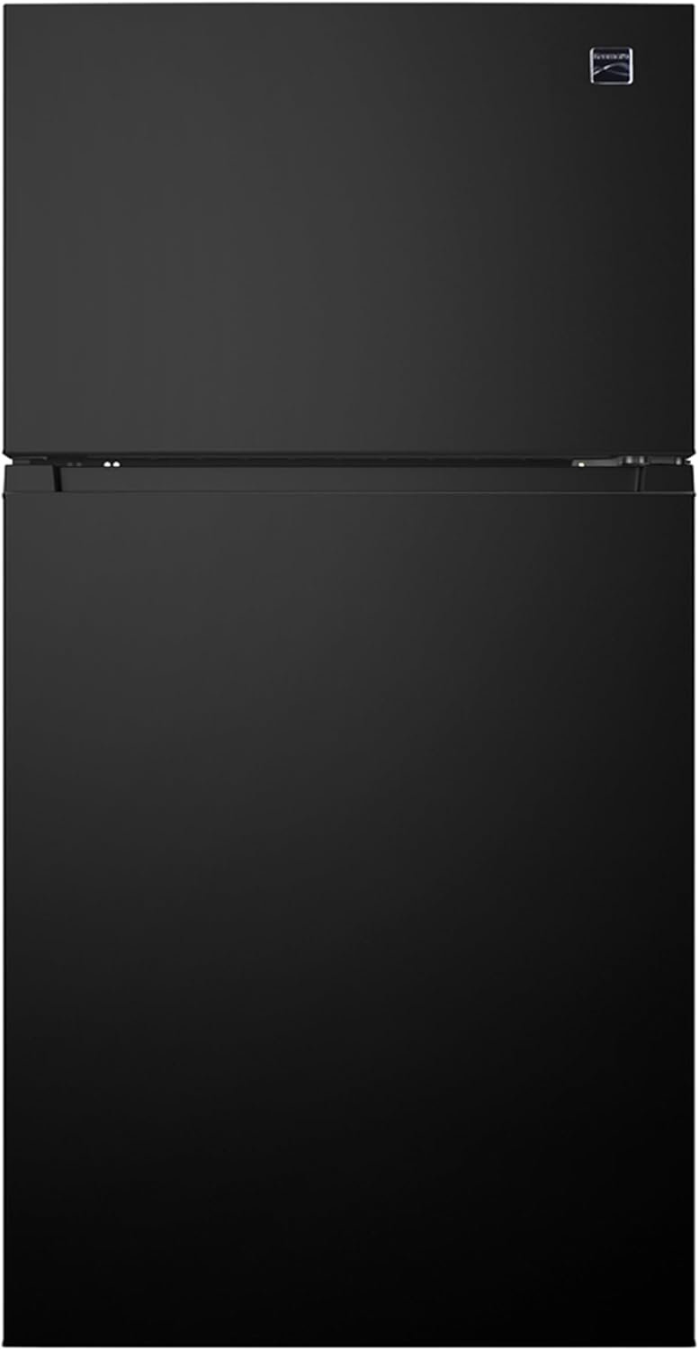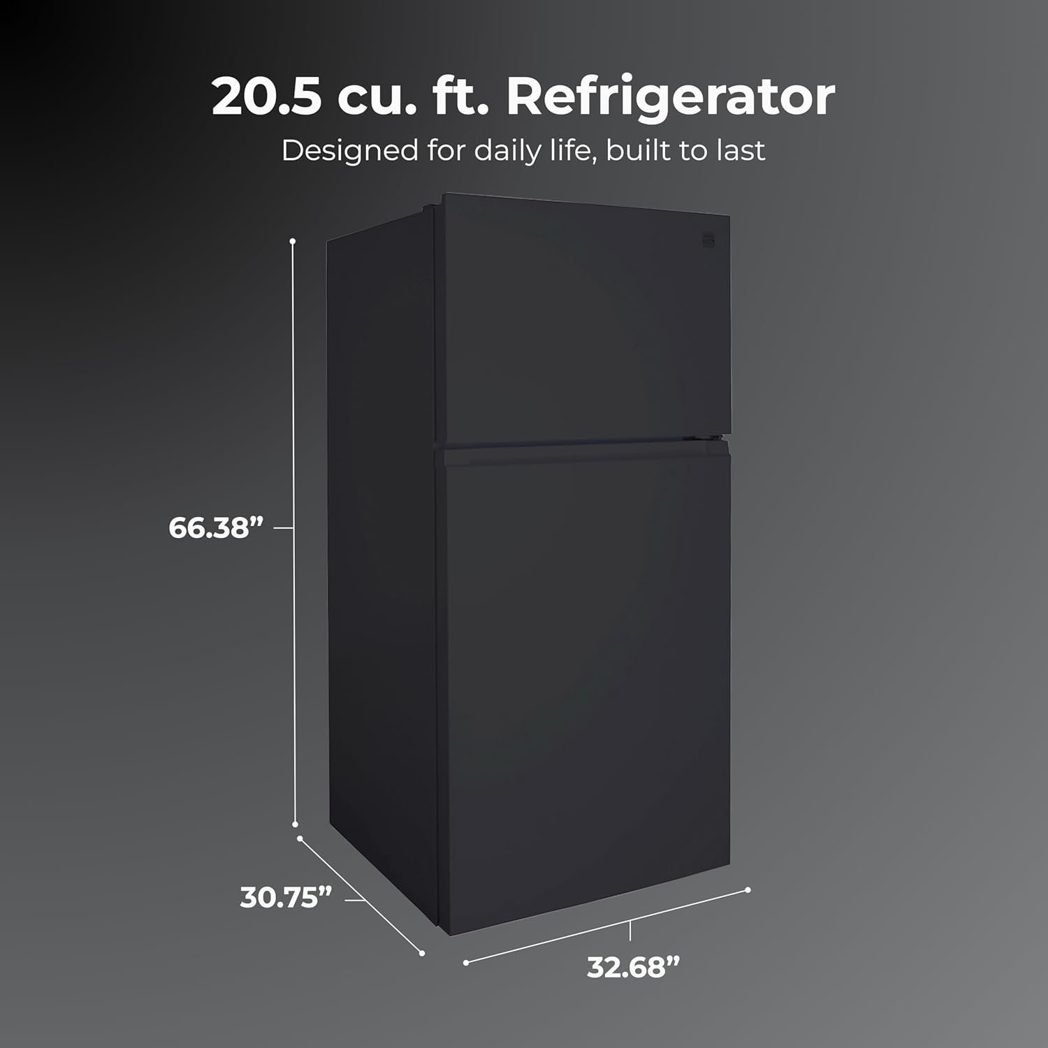 Maximize your kitchen space with the Kenmore 33″ Top-Freezer Refrigerator in black. With 20.5 cu. ft. of capacity and a 33-inch-wide footprint, its full capacity size offers plenty of room for fresh and frozen essentials. The standard-depth design lets it stand proud while storing party trays, groceries, and everything in between. Full width, adjustable glass shelves give you the flexibility to store wide or tall items with ease. Three clear door bins hold gallon jugs, condiments, and dressings, while two clear freezer door bins help keep smaller items organized. Humidity-controlled crispers keep produce fresher, longer, and the dedicated dairy compartment stores butter and spreads at just the right temperature. Long-lasting LED lighting casts natural light throughout the fridge so nothing gets lost in the back. The recessed pocket handle and flush-front design add a modern, easy-to-clean look that complements any kitchen style. ENERGY STAR certified for efficiency, and compatible with an optional icemaker that produces up to 3 pounds of crescent-shaped ice per day, this refrigerator is a smart, stylish solution for any home.