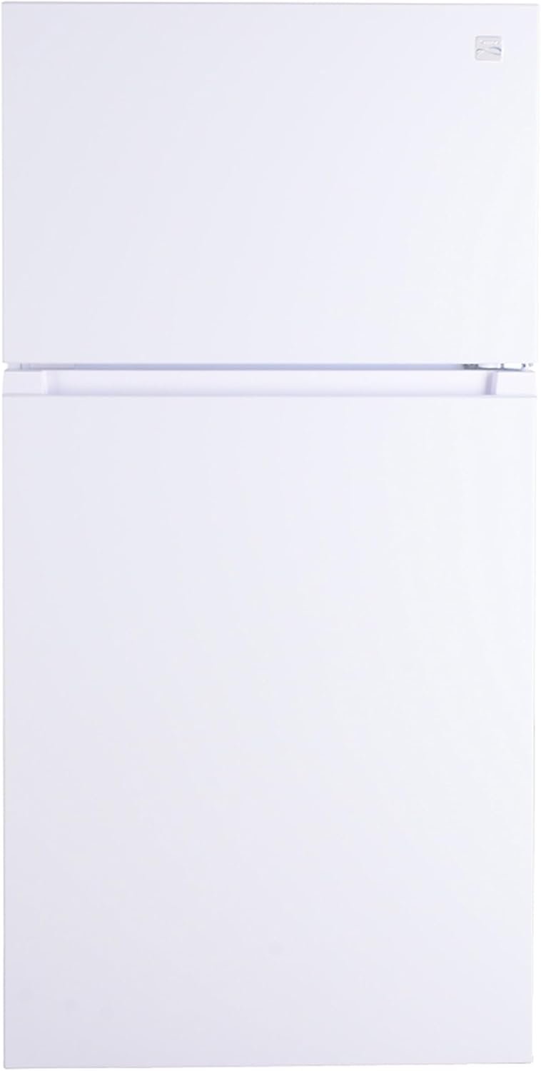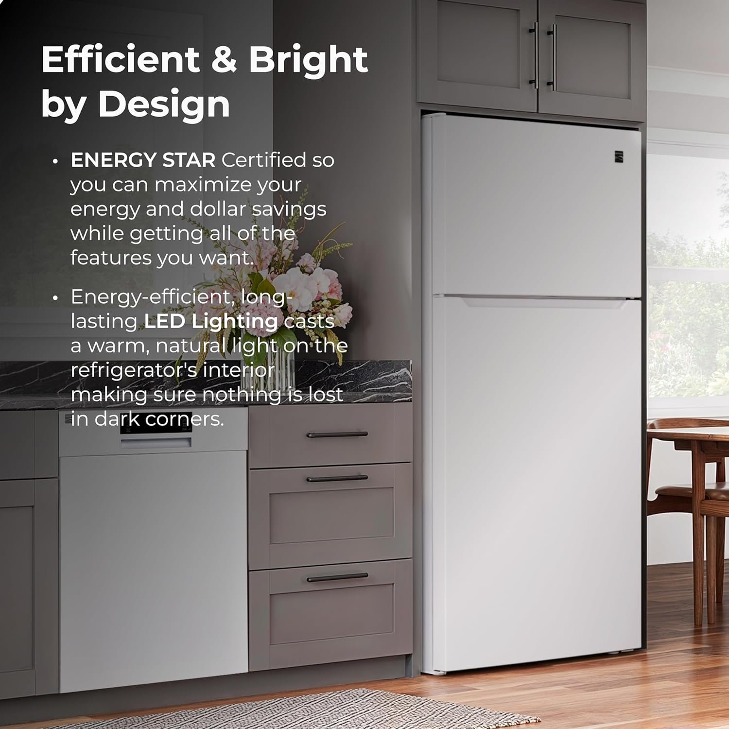 Maximize your kitchen space with the Kenmore 33″ Top-Freezer Refrigerator in white. With 20.5 cu. ft. of capacity and a 33-inch-wide footprint, its full capacity size offers plenty of room for fresh and frozen essentials. The standard-depth design lets it stand proud while storing party trays, groceries, and everything in between. Full width, adjustable glass shelves give you the flexibility to store wide or tall items with ease. Three clear door bins hold gallon jugs, condiments, and dressings, while two clear freezer door bins help keep smaller items organized. Humidity-controlled crispers keep produce fresher, longer, and the dedicated dairy compartment stores butter and spreads at just the right temperature. Long-lasting LED lighting casts natural light throughout the fridge so nothing gets lost in the back. The recessed pocket handle and flush-front design add a modern, easy-to-clean look that complements any kitchen style. ENERGY STAR certified for efficiency, and compatible with an optional icemaker that produces up to 3 pounds of crescent-shaped ice per day, this refrigerator is a smart, stylish solution for any home.
