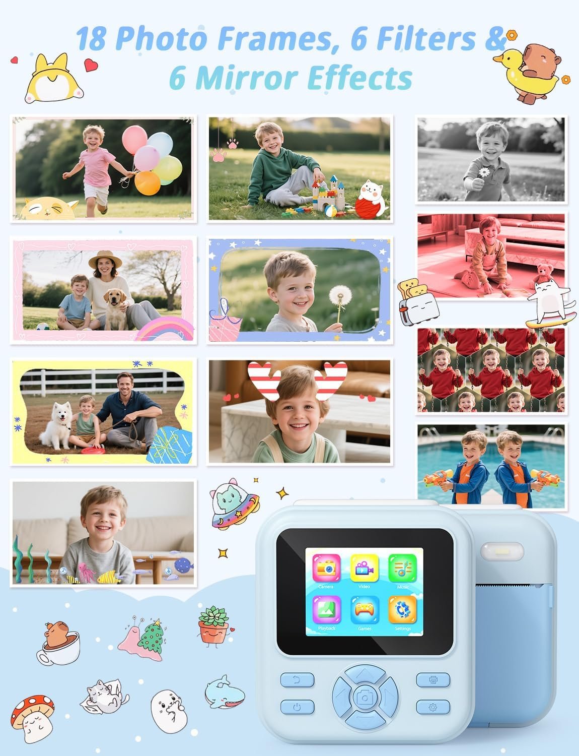 Creative Kids Camera Instant Print: This kids camera features dual functions of taking photos and instant printing. It comes with a 32GB SD card that can store thousands of colorful images, and includes 18 fun frames, 6 creative filters, and 6 mirror effects to fully inspire children’s creativity