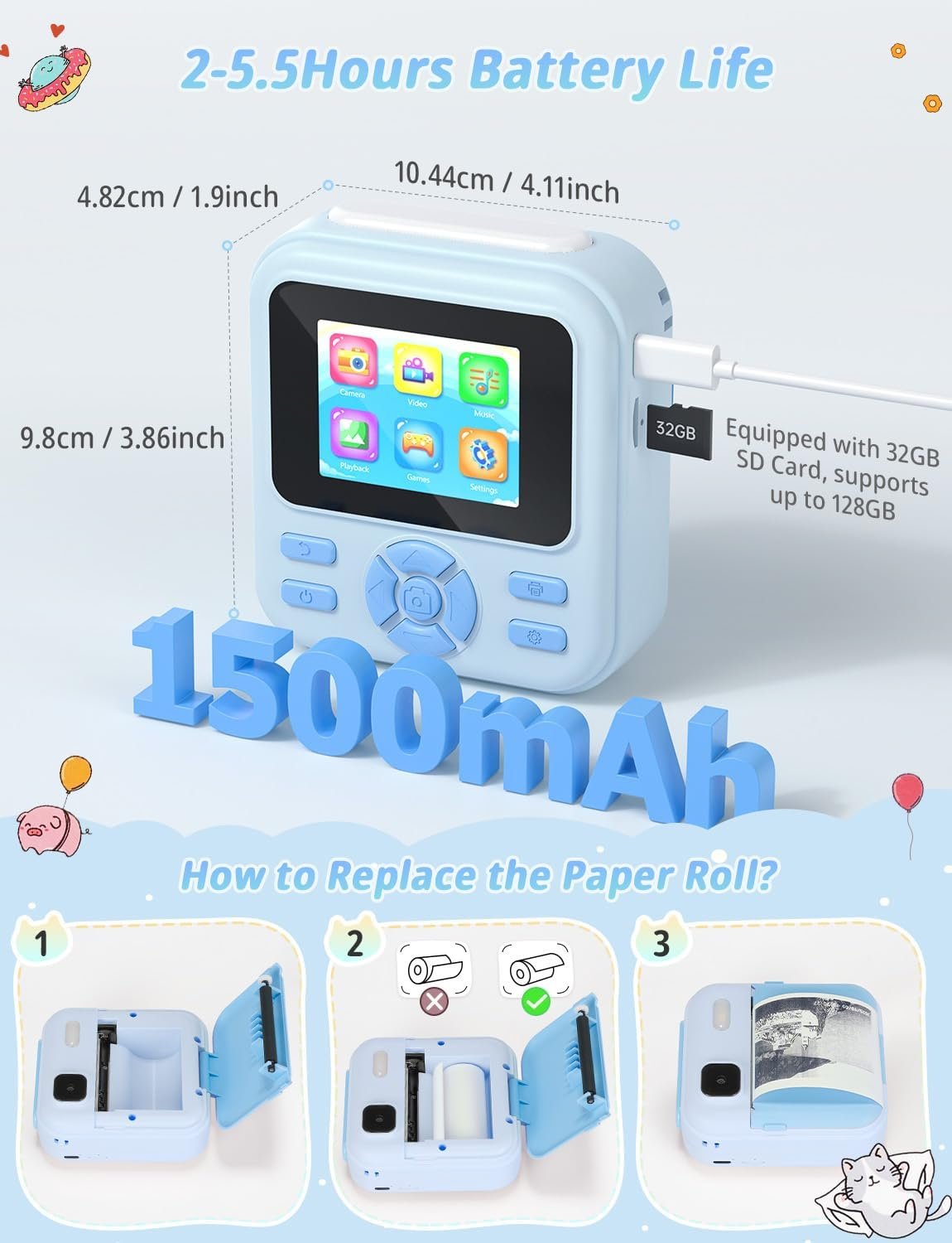Kids Camera Instant Print, 1080P HD Digital Video Kids Instant Camera for Girl Boys, Toddler Toys for Children Age 3-12 with 3 Rolls Print Paper & 32G Card (Blue)