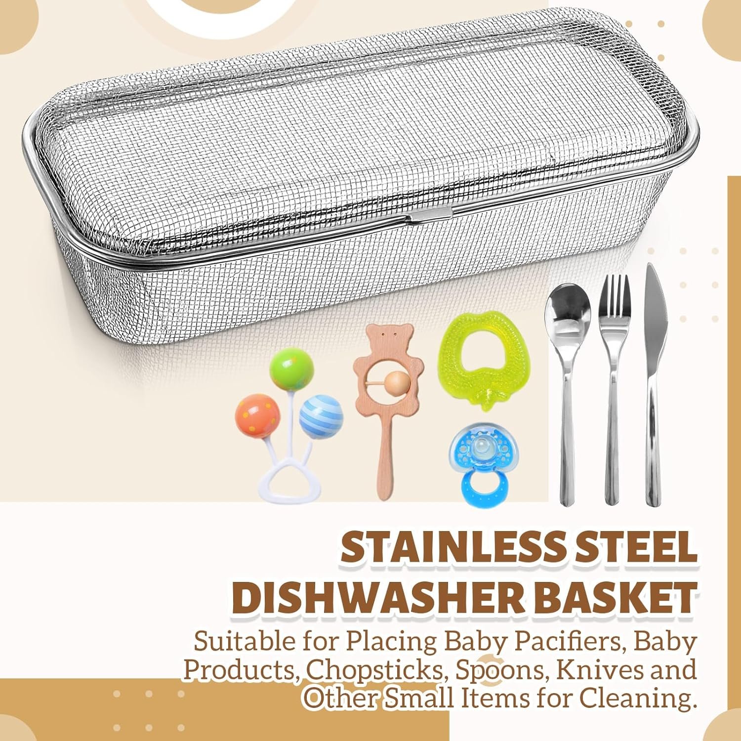Durable Stainless Steel: crafted from 304 stainless steel, this dishwasher basket boasts a long-lasting, rust resistant finish; It’s the thoughtful choice as a dishwasher basket for baby items, ensuring safe storage and washability of delicate accessories