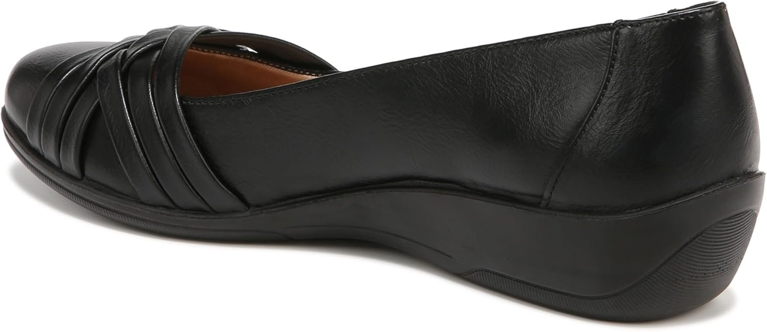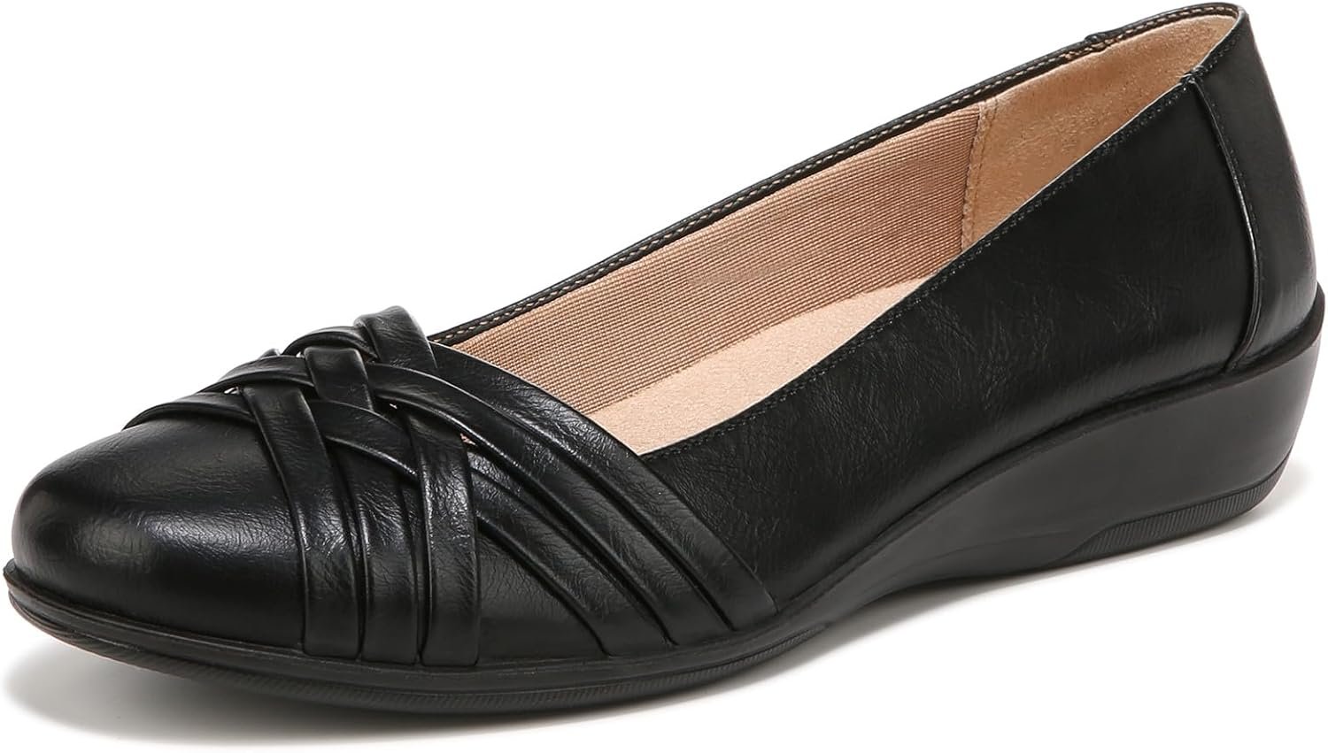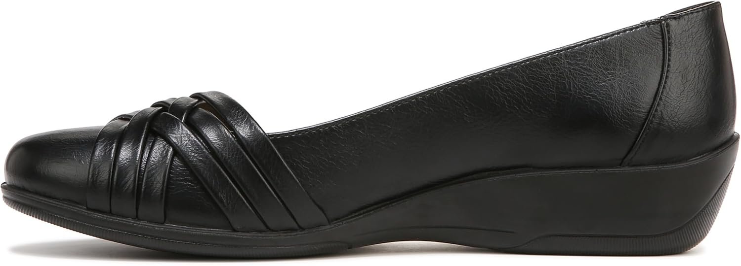 Go everywhere life takes you this season in a stylish flat with cute crisscross straps over a rounded toe. Faux leather with a round toe, slip-on fit, lightweight and flexible design, and overlapping strap design. Toe box, heel counter, and linings partially crafted with recycled materials. Soft System® comfort package provides all-day support, flex, and cushioning. Get next-level comfort with Velocity 2.0®, featuring luxe linings, superior cushioning, and a premium insole with shock absorption & pressure distribution. Traction sole provides you with extra stability. Just Right Height 1.75 inch wedge heel.