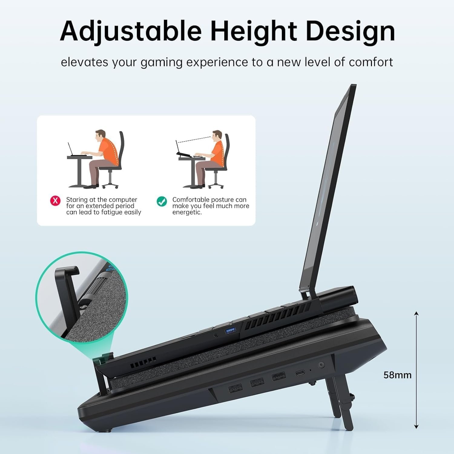 Sturdy Design & Ergonomic Height Adjustment: Achieve optimal stability and comfort with our laptop fan stand cooling pad. The double non-slip baffles securely hold your laptop on any surface, while the adjustable height feature helps reduce neck strain during extended use, ensuring a comfortable experience throughout your gaming or work sessions