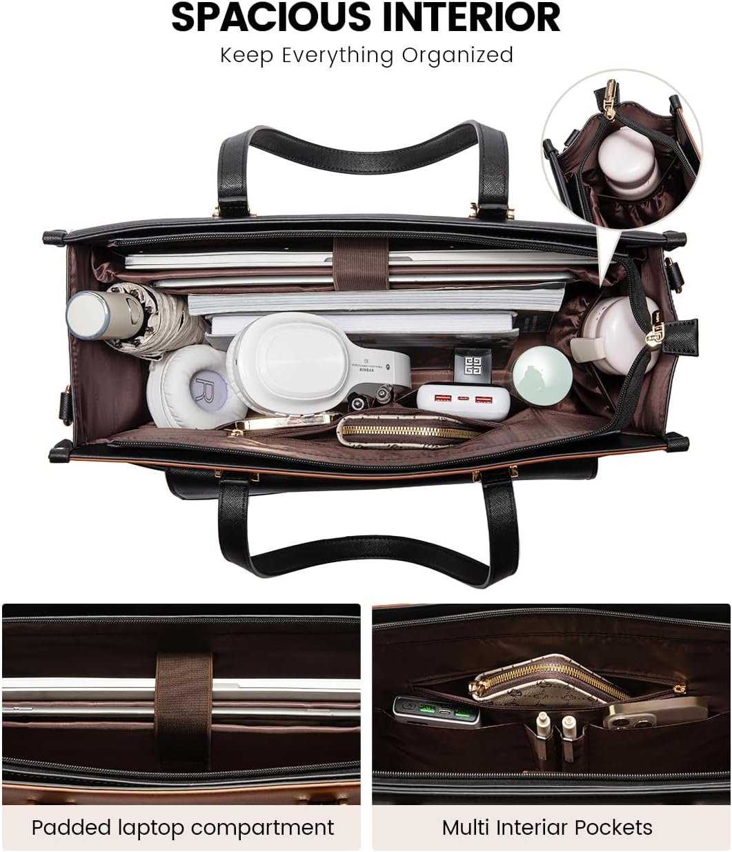 Multi-Pocket Work Bag for Women: Designed with 12 pockets, including a separate padded compartment that can accommodate a laptop(up to 16″) and tablet, and can also store A4 files, binders, pens and other daily office supplies, this women’s briefcase laptop bag ensures you are always prepared. The generous capacity accommodates a 40 oz water bottle, making it a perfect companion for work, travel, or any day on the go
