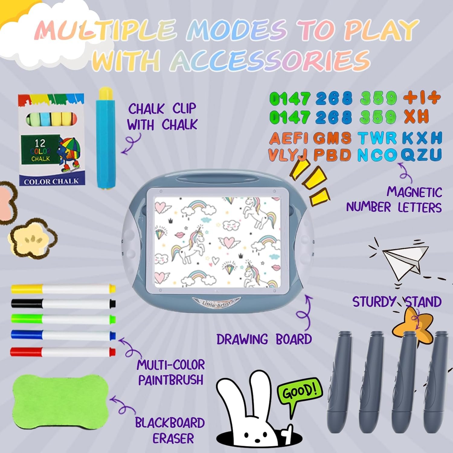 🎨【Rich Creative Accessories】- Comes with 1 chalk holder, 1 blackboard eraser, 5 colored pens, 12 chalks, 25 number templates and 26 English letter templates. kids can use these accessories to study and draw, and the interior and sides of the graffiti table also provide space to store accessories, making drawing more convenient.