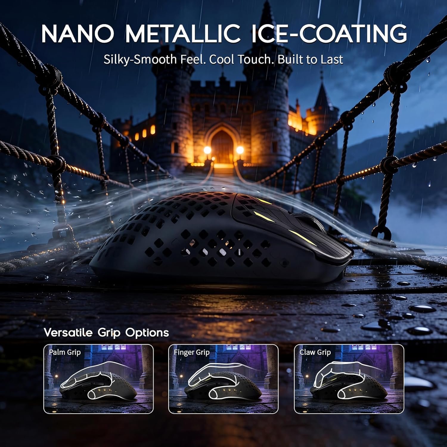 【Fully Customizable for Your Grip & Playstyle】Personalize your perfect setup. The package includes 100% pure PTFE feet for low-friction, smooth gliding for enhanced control. Its ergonomic, ambidextrous shape with a cool-touch coating suits palm, claw, and fingertip grips, reducing fatigue during long sessions. Program buttons, DPI, and macros via intuitive software.