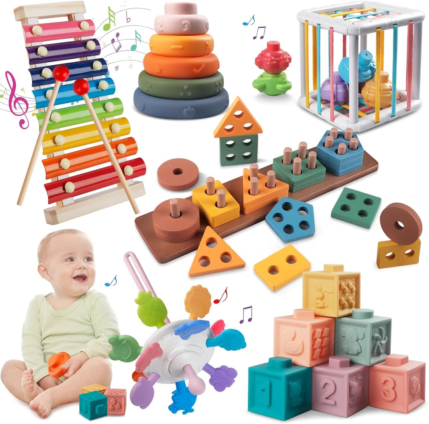 6 in 1 Montessori Toys for 2 Year Old: The Montessori baby toys feature building blocks, stacking rings, pull-string toys, wooden sorting toys, hand-tapping xylophone, and cube toddler toys. Encouraging color and shape recognition, sorting skills, fine motor skills, hand-eye coordination, spatial awareness, cognitive flexibility, and logical thinking. Nurture your baby’s exploration with our educational baby stacking toys.