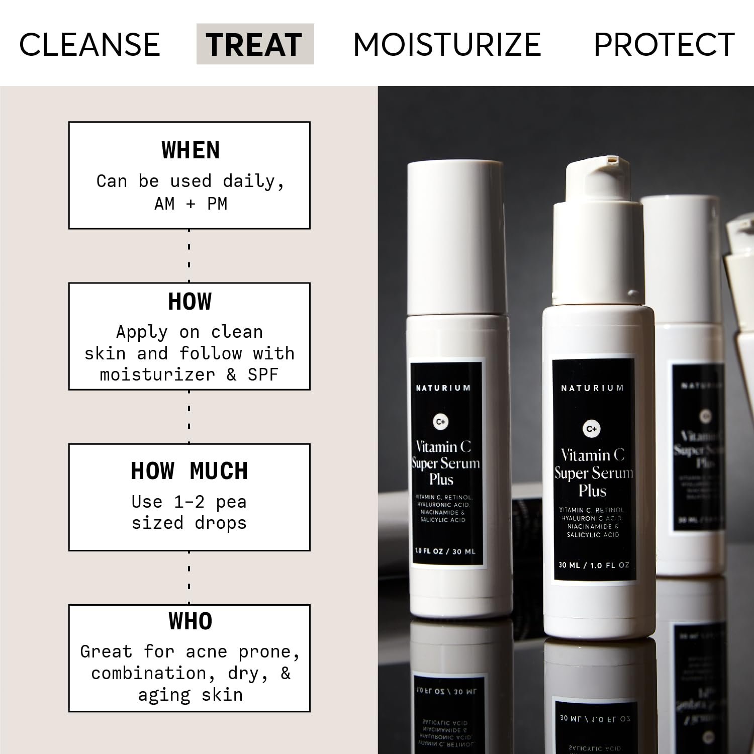 MOST SKIN TYPES: Appropriate for those with aging, blemish-prone, combination, and dry skin, though a patch test prior to use is advised. Can be applied daily (AM + PM), using 1-2 pea sized drops on clean skin, following with a moisturizer and SPF