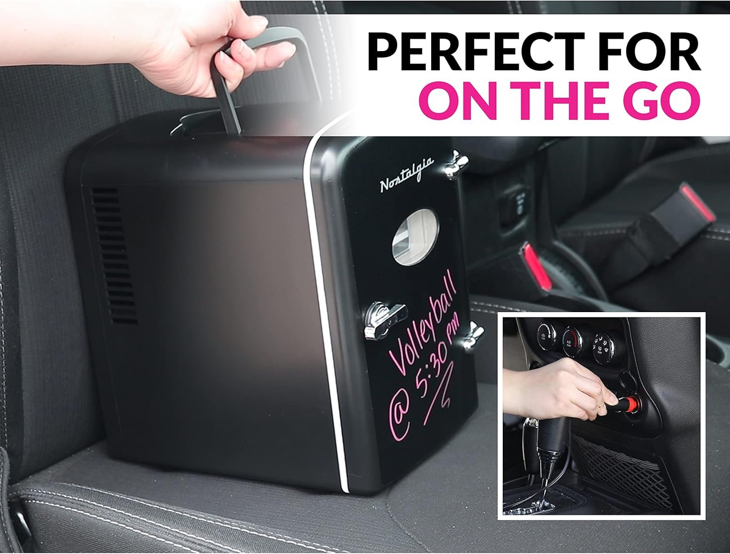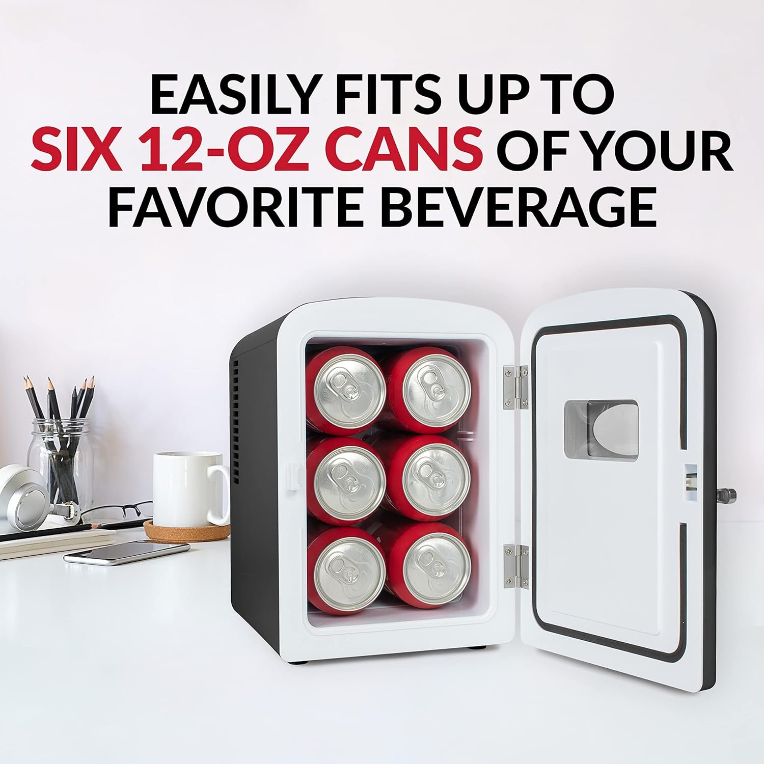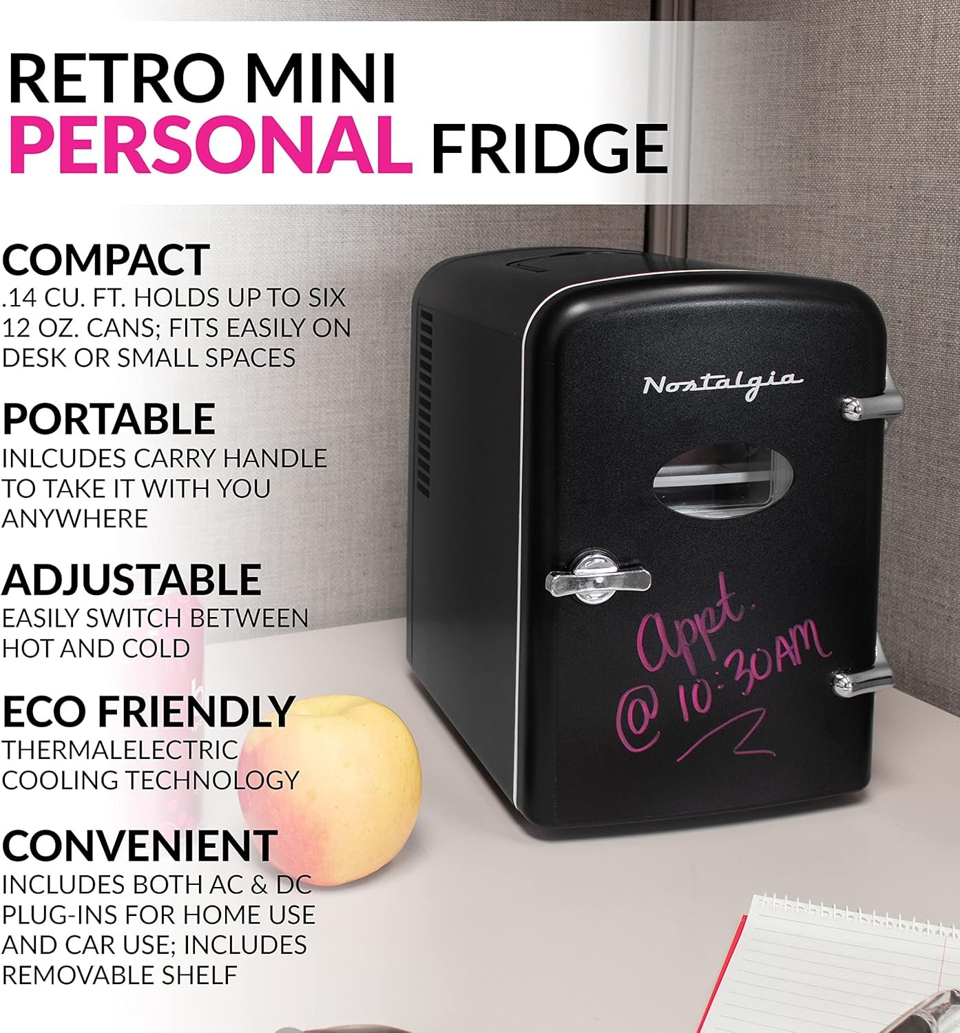 Enjoy perfectly chilled or warmed beverages and snacks anytime with the Nostalgia Retro Mini Fridge and Heater. This versatile, compact fridge holds up to six 12-ounce cans and switches from cool to warm to suit your needs. Equipped with thermoelectric technology, it includes both AC and DC power cords for easy use in a variety of spaces—from your desk or dorm to your car or boat. With retro features like a see-through window and chrome accents, this fridge combines functionality and style.