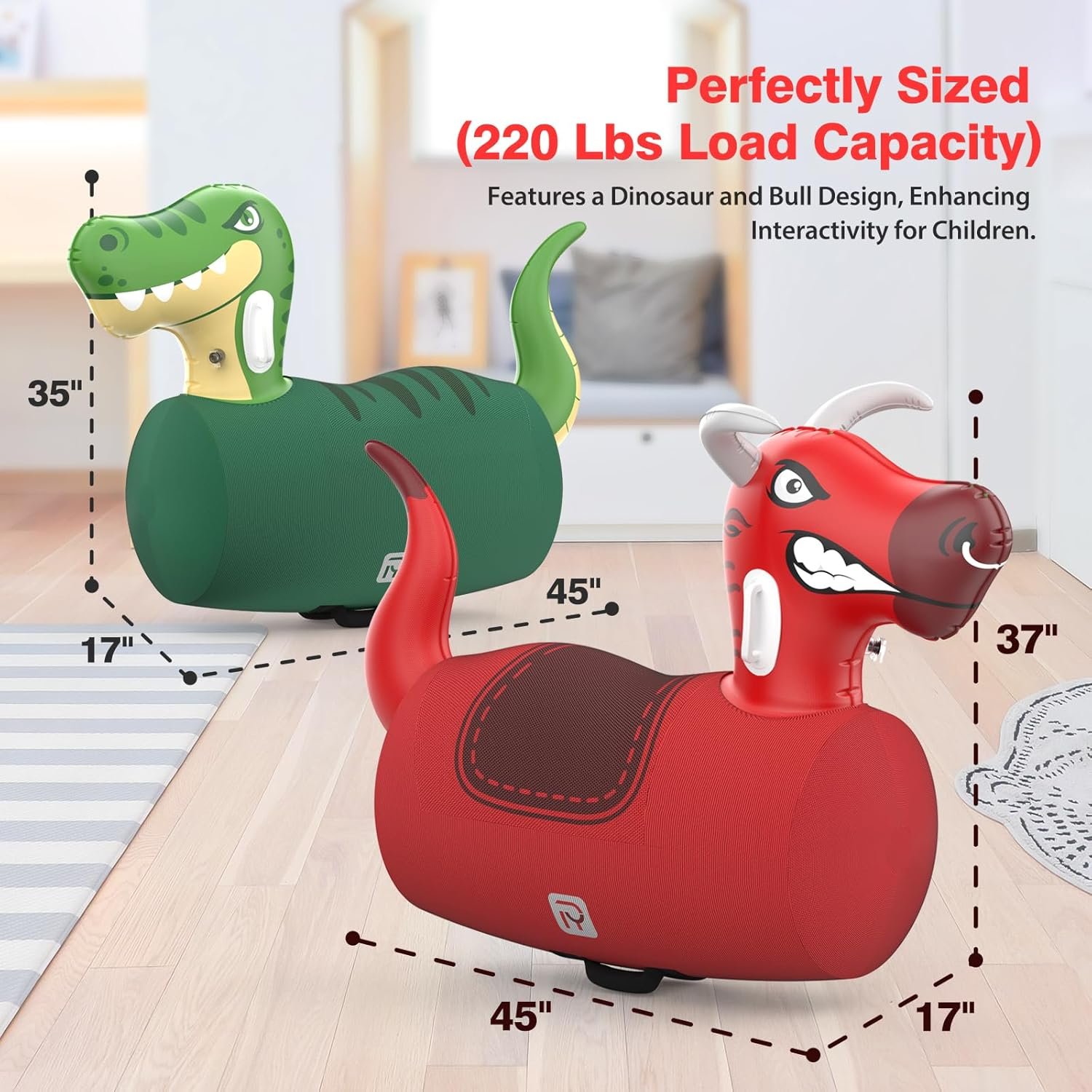 Two Pack for Double the Fun: Dinosaur & Bull Ride-On Toys Combo! Unleash double the excitement with our inflatable dinosaur toys and bull pair! This 2-pack encourages social interaction, friendly bouncing competitions, and cooperative play, helping kids create unforgettable memories together while developing balance and coordination