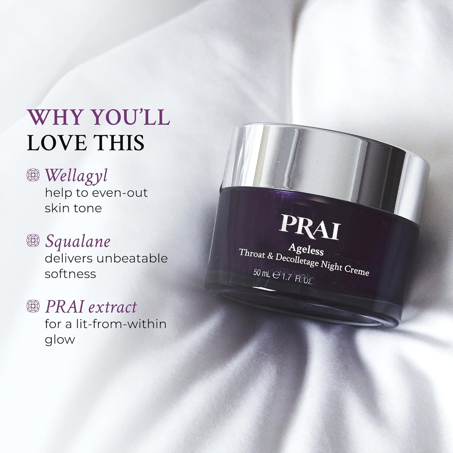 Night Cream for Neck – It also contains Wellagyl that helps hydrate and firm delicate skin, Squalane that delivers unbeatable softness, and PRAI oil for a lit-from-within glow. This neck cream features Sepilift technology to lift and tighten the skin.