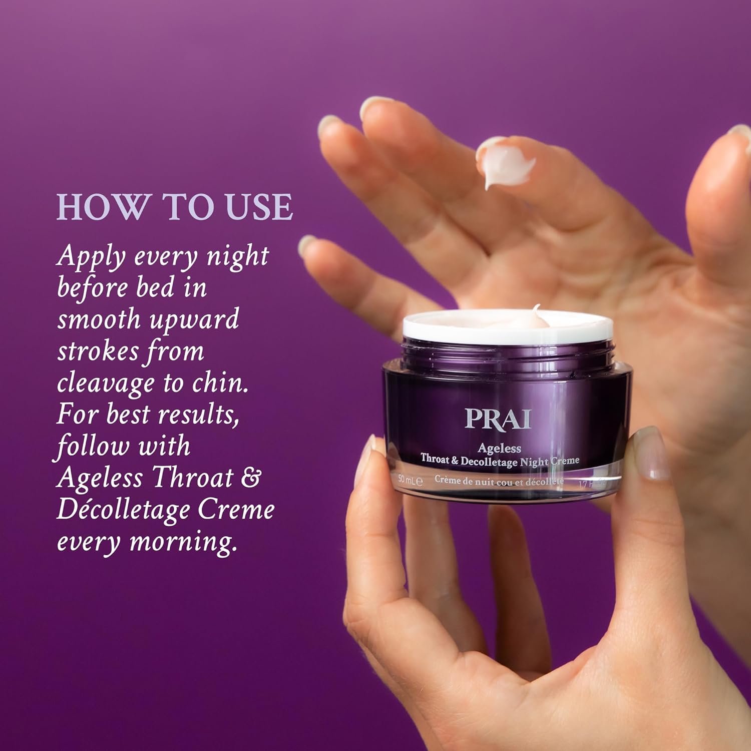 Neck Skin Firming and Tightening Lotion – PRAI Beauty Ageless Throat & Decolletage Night Creme contains Encapsulated Retinol that boosts collagen and dramatically smooths wrinkles and Hyaluronic Acid to plump and fill-in wrinkles.