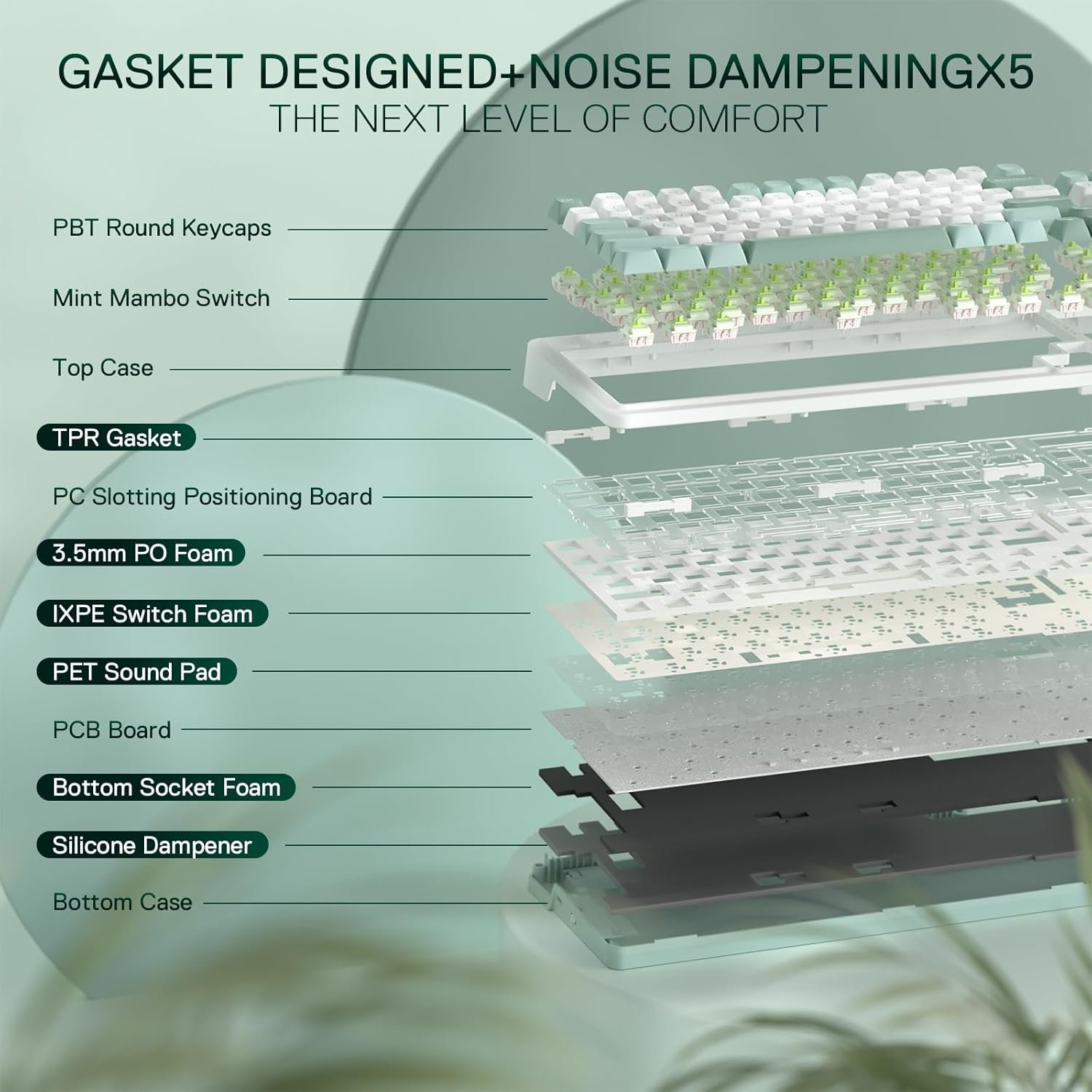Custom Mint Mambo Switch – With thick-lubed custom linear switches combo with a gasket form factor, K719 features cushioned rich linear travel with silky creamy and cozy typing feedback. The brand new upgraded socket is nearly all switches(3/5 pins) compatible.