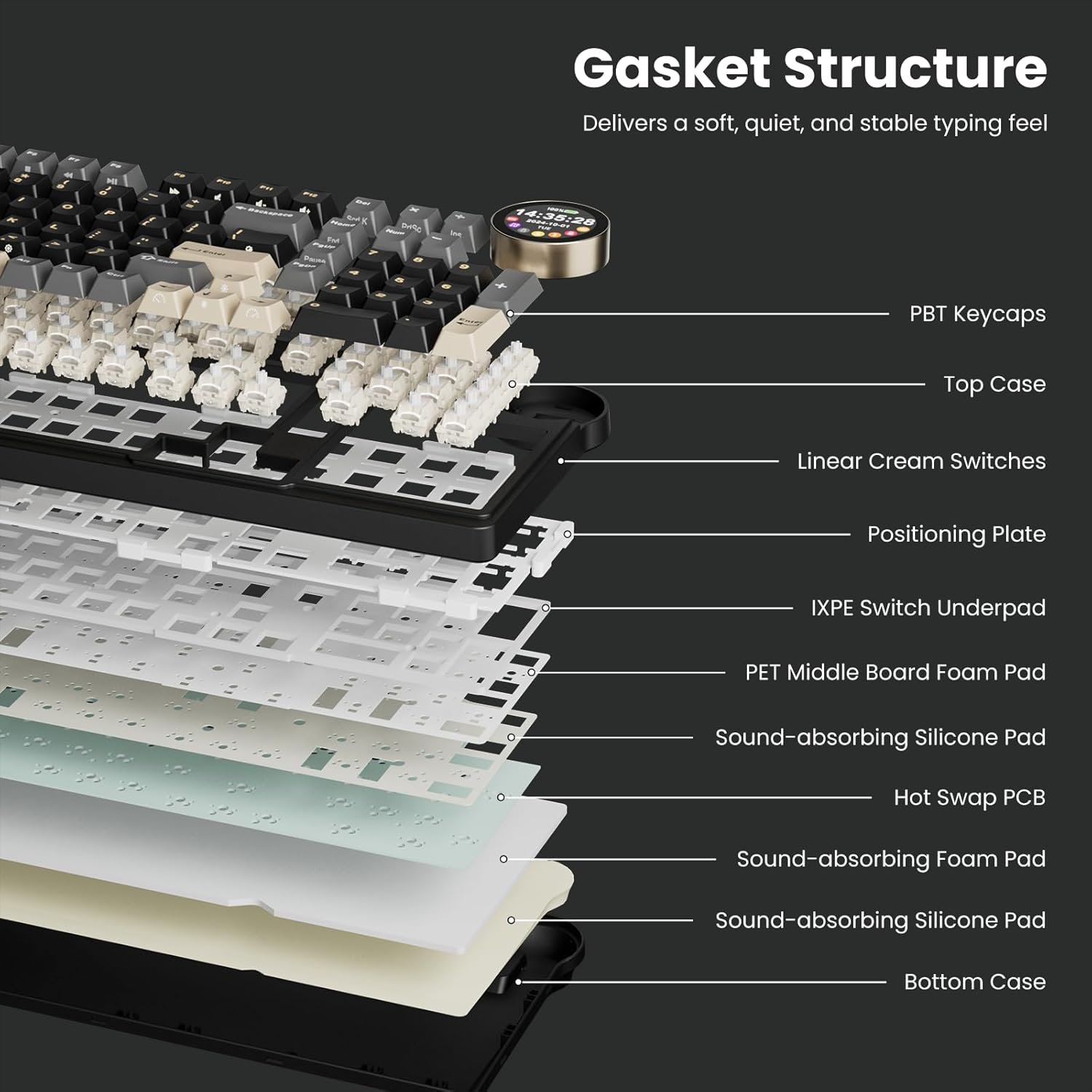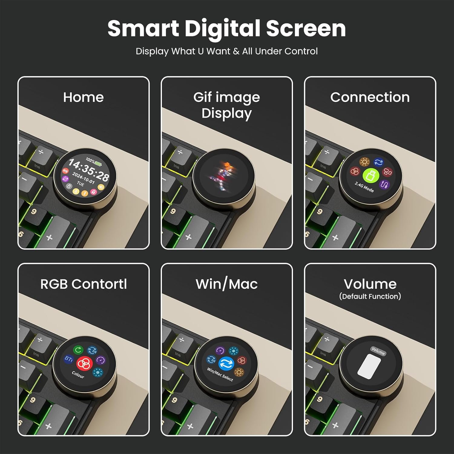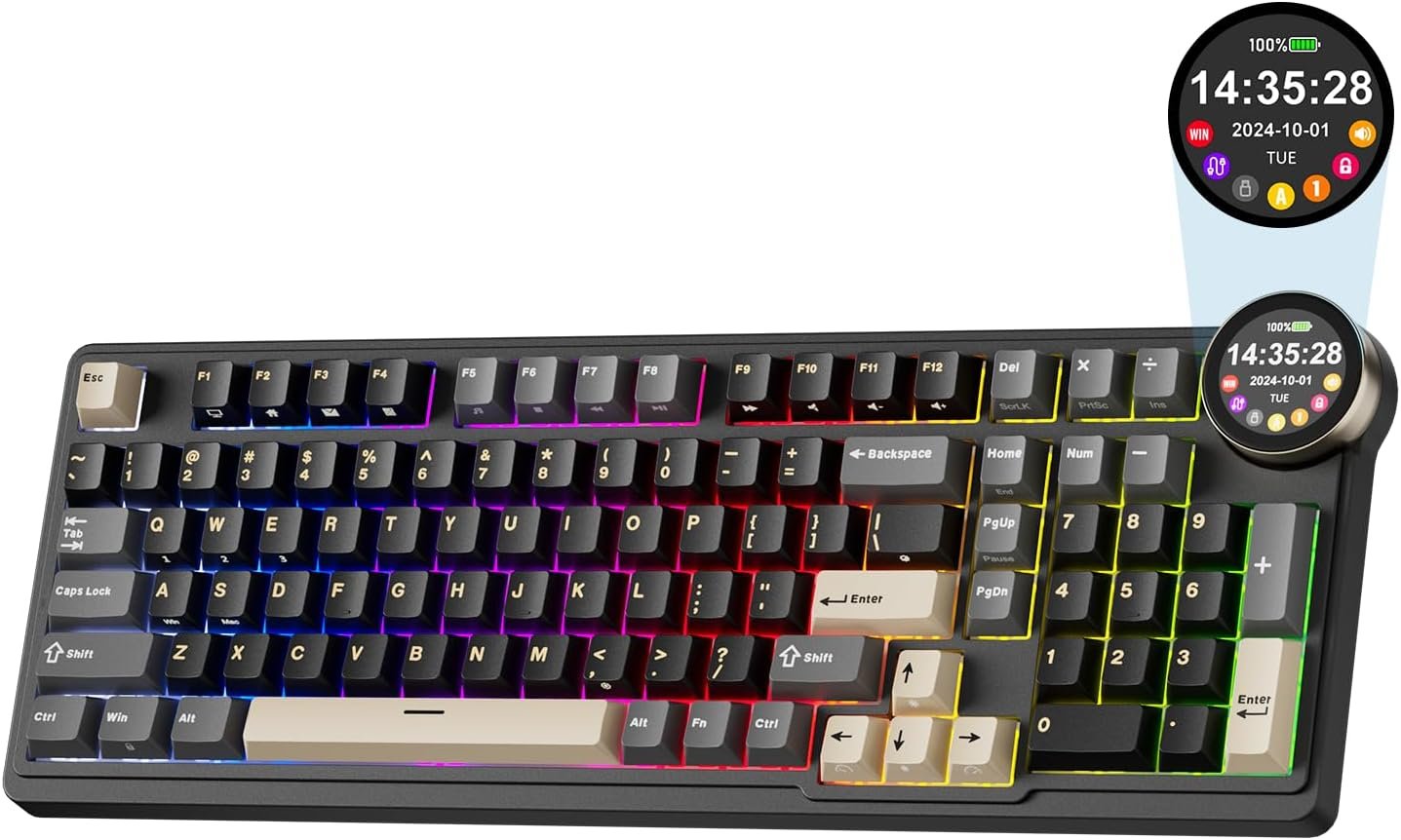 【Integrated Screen & Control Knob】: The 96% wireless mechanical keyboard is equipped with a smart touch screen featuring 14 interfaces and 4 core functions, including home display, connection modes, backlight brightness/speed, RGB effects/colors, WIN/MAC layout, and volume control. Simply turn or press the knob to take full control and work more efficiently. The screen also displays a clock and custom GIFs, allowing you to personalize your setup for a clean and modern workspace.
