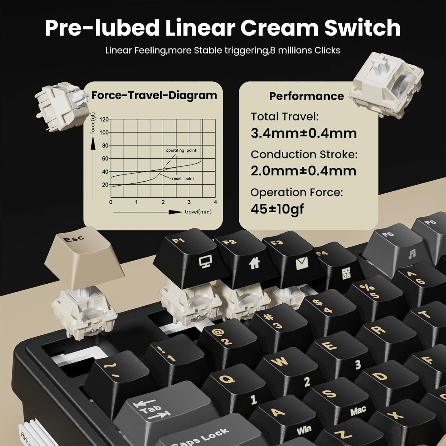 【Hot-Swappable Cream Switches】: The hot swappable mechanical keyboard features pre-lubricated stabilizers and cream linear switches, delivering a smooth and comfortable typing experience with a pleasant creamy mechanical sound. This creamy keyboard with number pad has a high-quality PCB supports 3/5-pin hot-swap, allowing even beginners to easily customize or upgrade their keyboard without soldering.