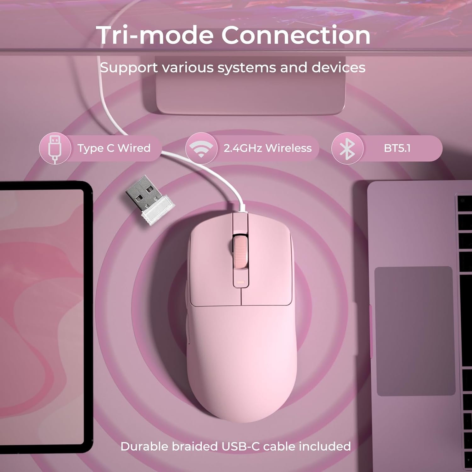 Tri-Mode Connectivity — Effortlessly switch between 2.4G wireless, Bluetooth 5.1, and USB-C wired modes with a simple press of the bottom button. Whether you’re gaming, working, or studying, this computer wireless mouse delivers seamless performance to match your needs.