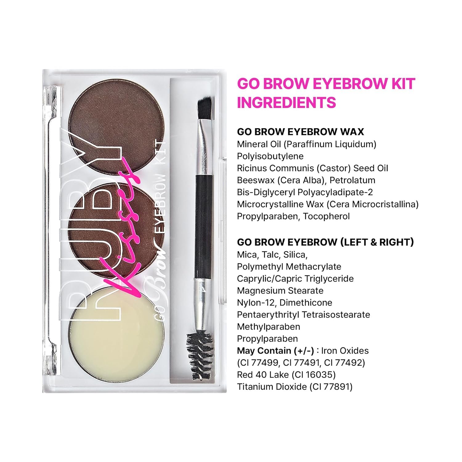 How to use: 1. Brush eyebrow 2. Apply the brow wax using the spoolie brush to groom and shape 3. Fill in sparse areas with the brow powder using the angle brush