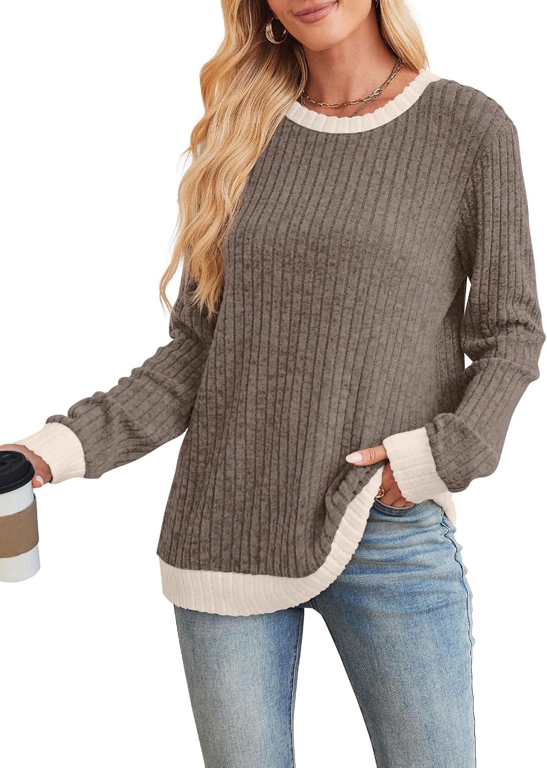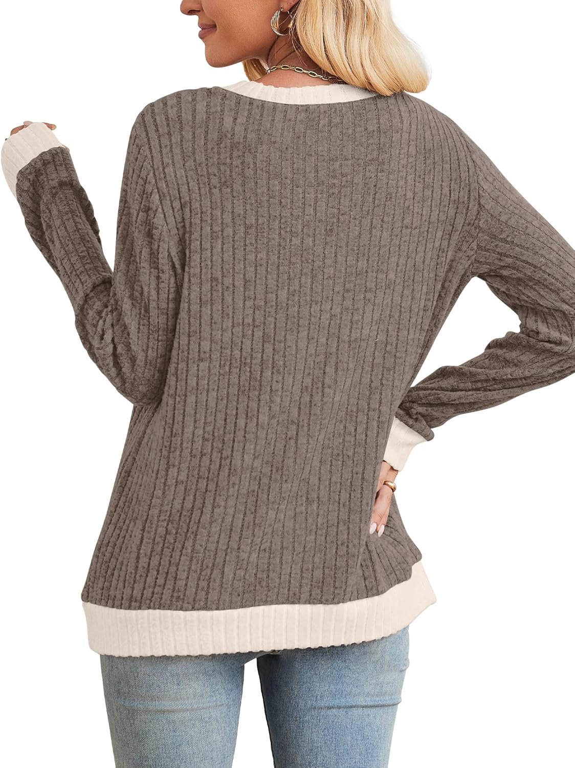 Sampeel Womens Tops Long Sleeve Shirts Lightweight Sweaters Loose Fit Crewneck Color Block Fall Fashion Outfits
