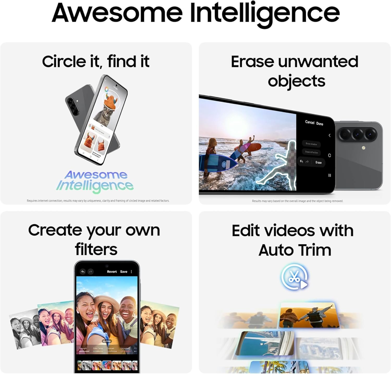 AWESOME MADE EASY: The Awesome Intelligence of Galaxy A56 is like having a suite of superpowers. You can find answers quicker using Circle to Search with Google.7 Plus, get the photos and videos you want with tools like Best Face and Auto Trim .