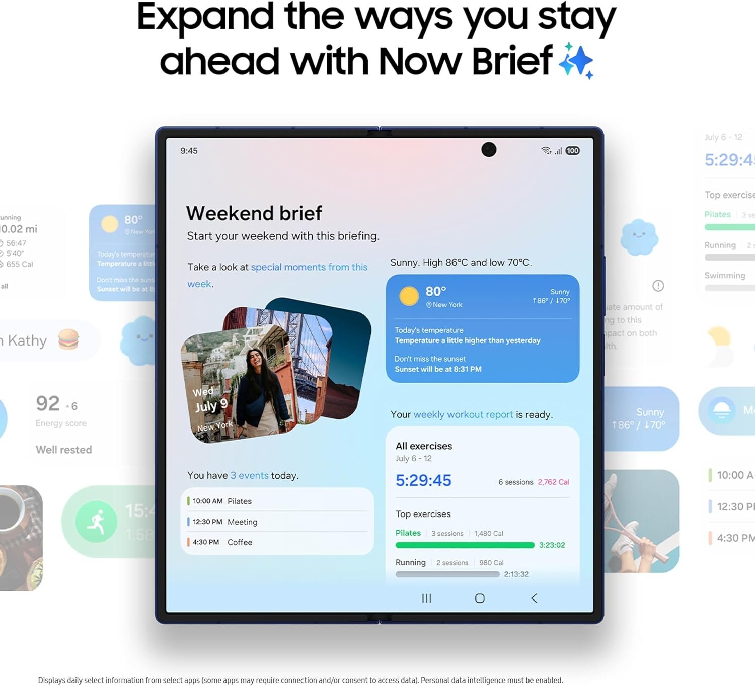 EXPAND THE WAYS YOU STAY AHEAD: With Galaxy Z Fold7, you get to decide how to stay ahead. See your daily briefings at a glance on the cover screen, or unfold your phone for an expansive view.