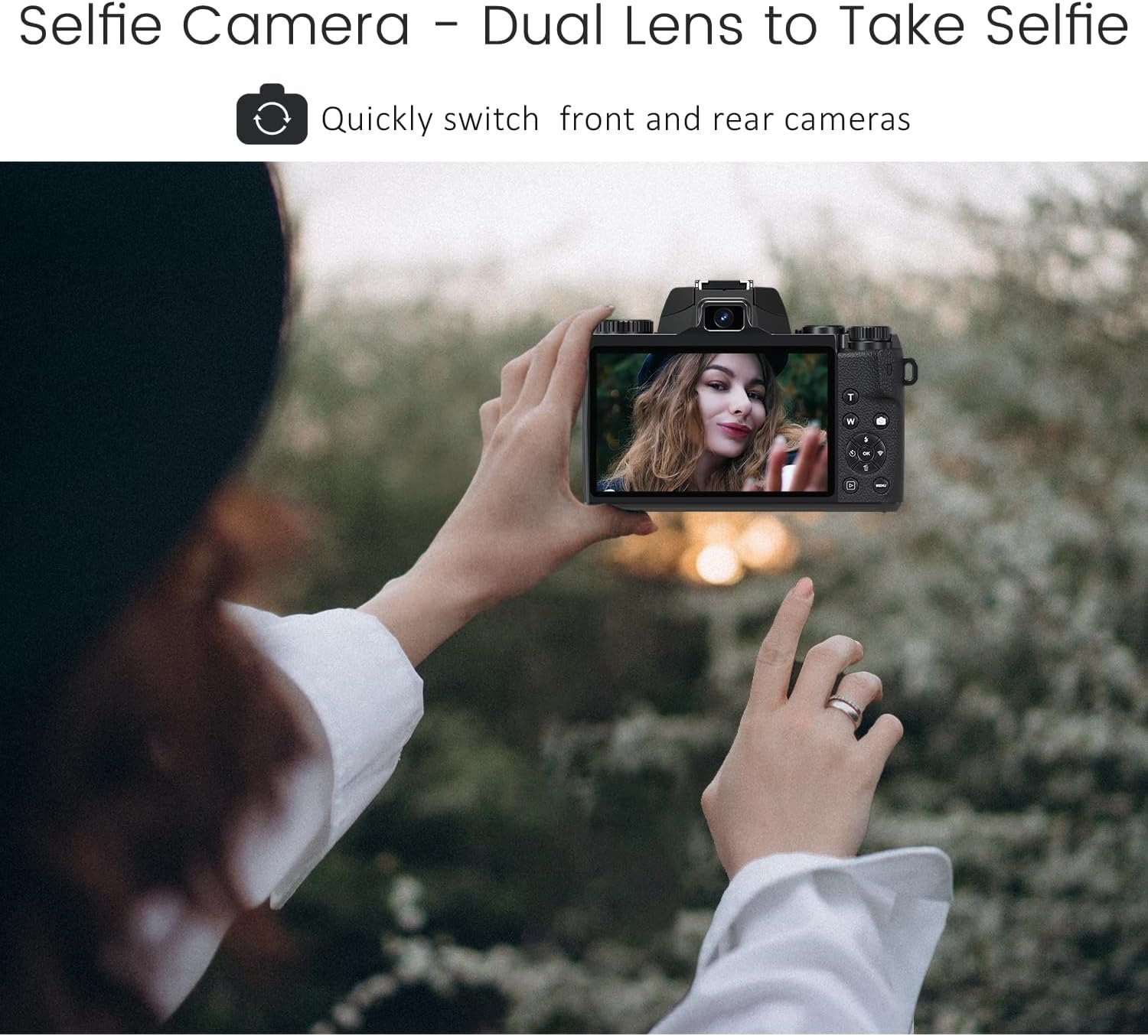 4.0″ Touch Screen & Dual-Lens camera: This camera supports 4.0-inch touch screen. Equipped with dual lens,easy switching to front camera, you can see what you are recording or the picture framing while doing self blogging