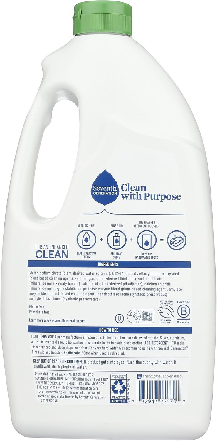 Dishes should be odorless and clean after you wash them, right? We think so too. That’s why Seventh Generation Free & Clear Dishwasher Detergent Gel uses plant-based enzyme blends for high cleaning power without the use of dyes and fragrances. This dish soap is free of phosphates and chlorine bleach, and it’s biodegradable so you can always feel good about what you dish out. For more than 25 years, Seventh Generation has been thoughtfully formulating safe* and effective plant-based products that work. Really well. Our dishwashing detergent uses powerful plant-based ingredients like surfactants and enzymes to break down tough residue and lift away food leaving your dishes sparkling clean. So how does it all work? The enzymes cut through grease and food by breaking down starch and protein-based residue while the surfactants remove dirt and grease by holding the molecules in suspension so they can wash away. Yes, even those fussy egg stains. Based in Vermont, Seventh Generation is proud to be a Certified B Corporation. B Corps are certified to be better for workers, better for communities, and better for the environment. By choosing Seventh Generation products, you’re joining us in nurturing the health of the next seven generations. *Safe when used as directed