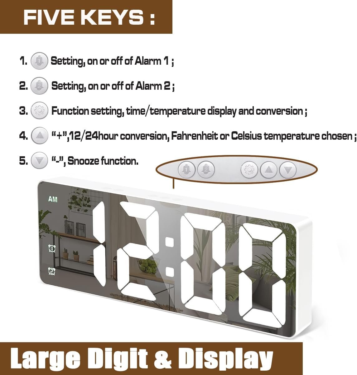 【Customizable Alarms】: Our digital desk clock offers 2 alarm modes to suit your weekday preferences. Easily set the alarm clock by short pressing the Alarm Clock 1 or Alarm Clock 2 button. Press and hold for 3 seconds to turn the alarm on or off. When the alarm sounds, simply press the “Down” button to enter snooze mode and enjoy an extra sleep