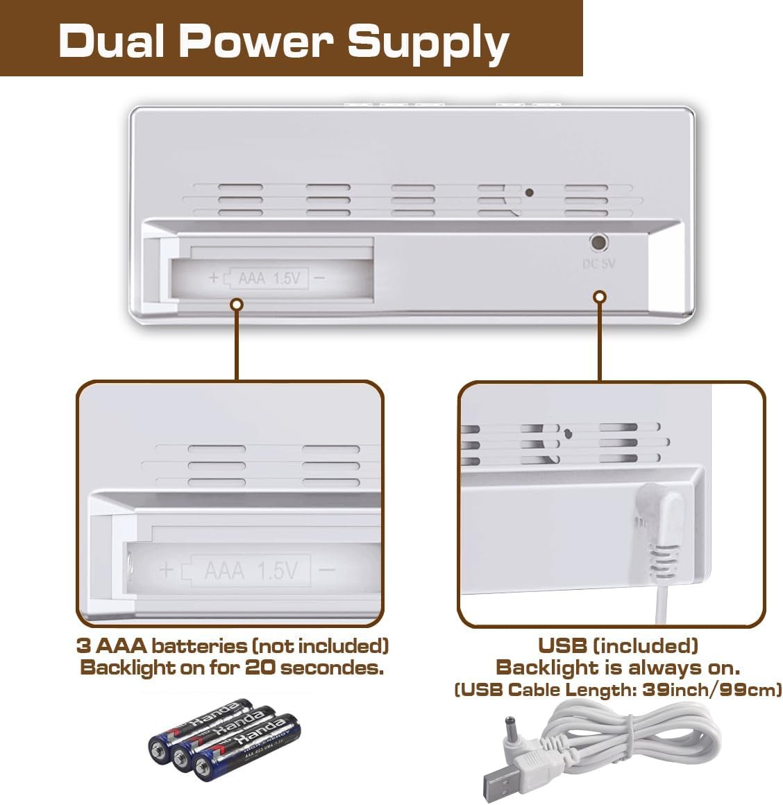 【IMPORTANT】 1. You can activate the display by make some noise like clapping or touching the clock. 2. If you want to keep the screen always on, please use the DC power. 3. When powered by 3 AAA batteries, the display turns off after 20s.