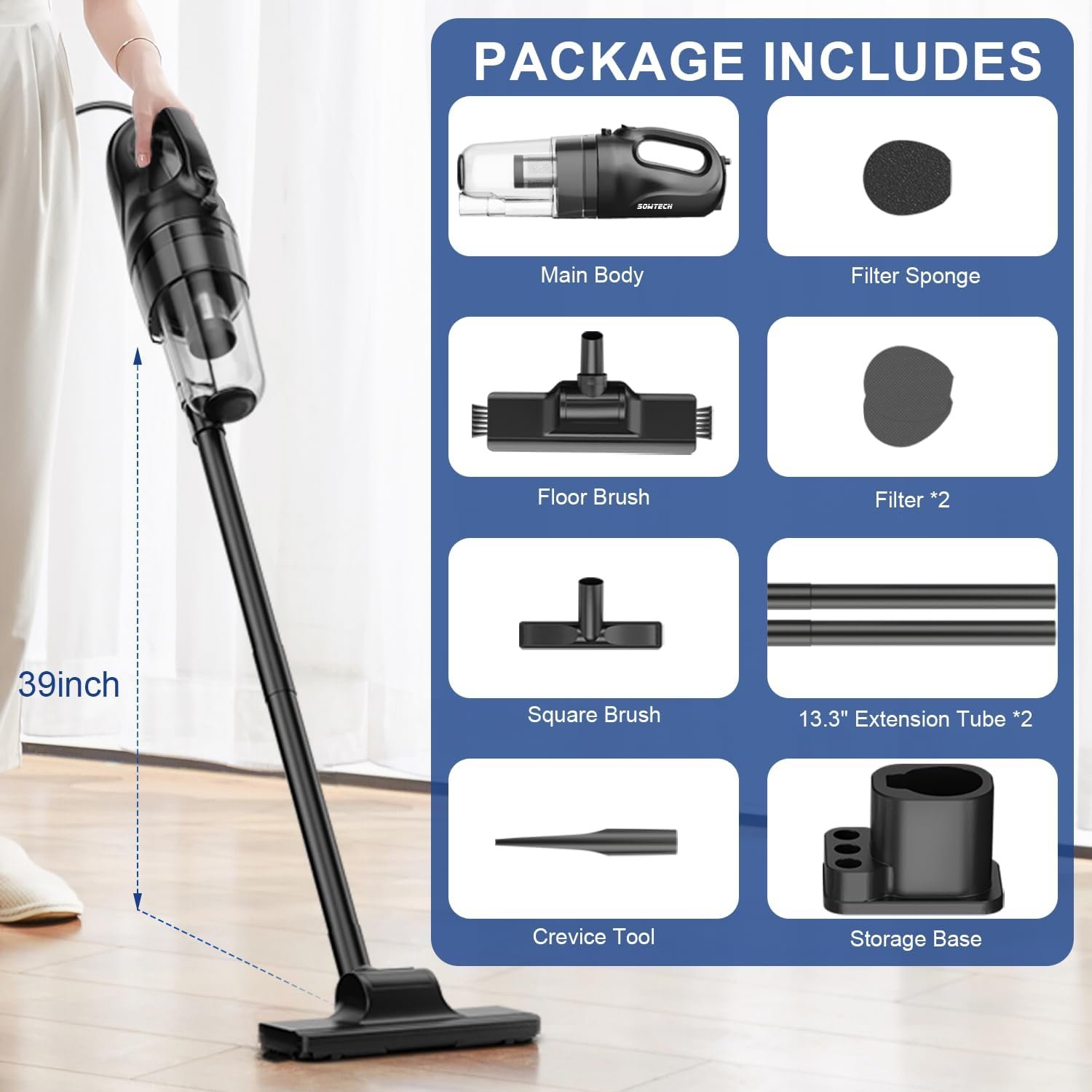 WASHABLE & REUSABLE FILTER: Our vacuum cleaners are equipped with stainless steel filters and sponge filters. You can directly rinse it with water after each use, reusable and easy to clean. The vacuum cleaner comes with a storage base for easy storage in a corner or locker.