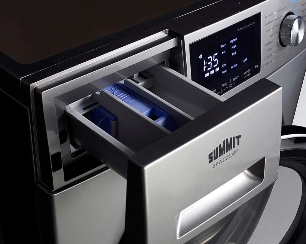SUMMIT SPWD2203P is a 24″ wide washer/dryer combo designed to maximize laundry capacity in an easy fit. This non-vented condensing (ductless) 115V washer/dryer comes in a modern platinum finish. The stainless steel drum offers a generous 2.7 cu.ft. capacity to accommodate larger laundry loads than previous versions of this unit. The front-loading design features a large, easy-to-open glass door and pull-out dispenser for detergent, pre-wash, and fabric softener.