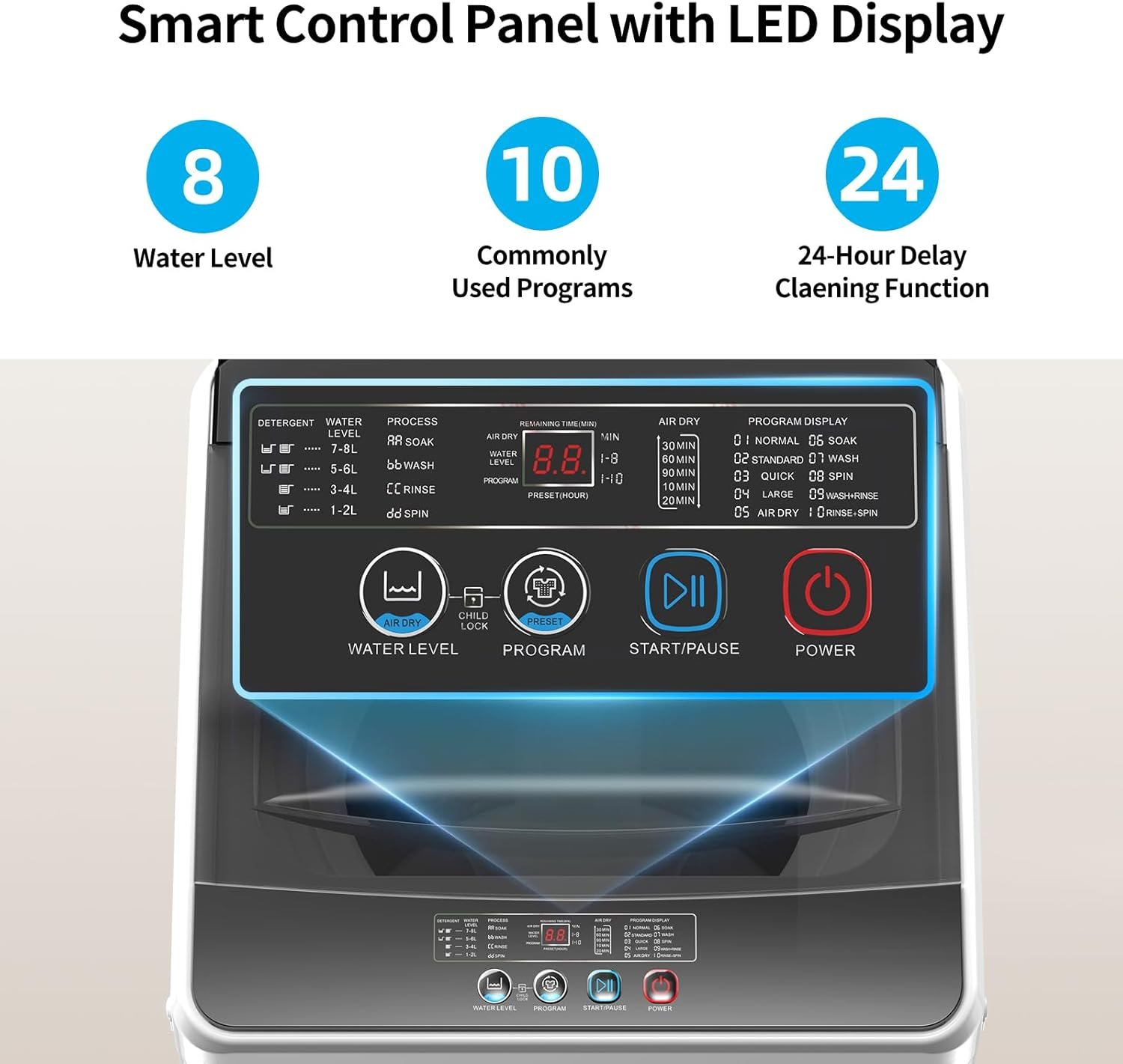 Washer:【Multi-Function Control Panel】The washing machine comes with 10 washing programs and 8 water levels on the control panel for easy operation. All functions and operation including water level/spin, program/delay, time set are listed clearly. Detergent and procedure choice are also included to meet your various needs.