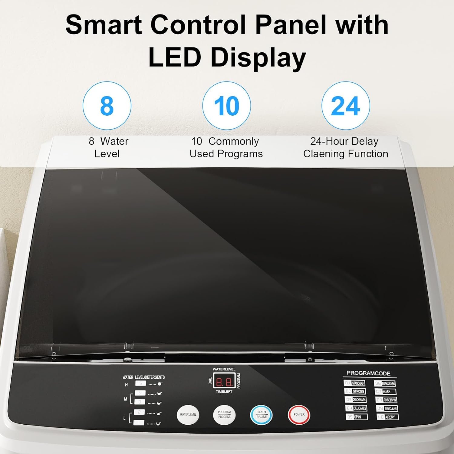 Washer:【Multi-Function Control Panel】The washing machine comes with 10 washing programs and 8 water levels on the control panel for easy operation. All functions and operation including water level/spin, program/delay, time set are listed clearly. Detergent and procedure choice are also included to meet your various needs.