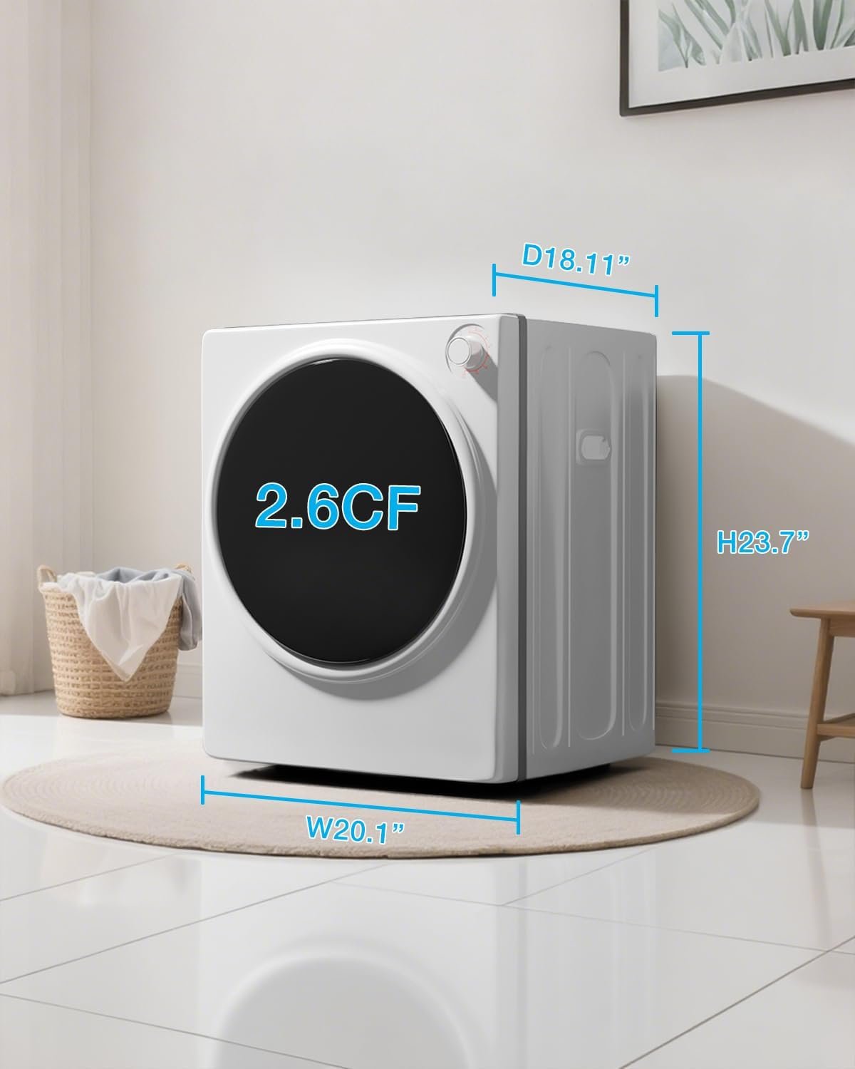 Dryer:【Powerful Performance】This electric dryer with 2.6 Cu Ft large capacity, this portable clothes dryer can ensure your clothes to be dry sooner. Even though it lasts rainy, you can still put on our beautiful dresses every day.