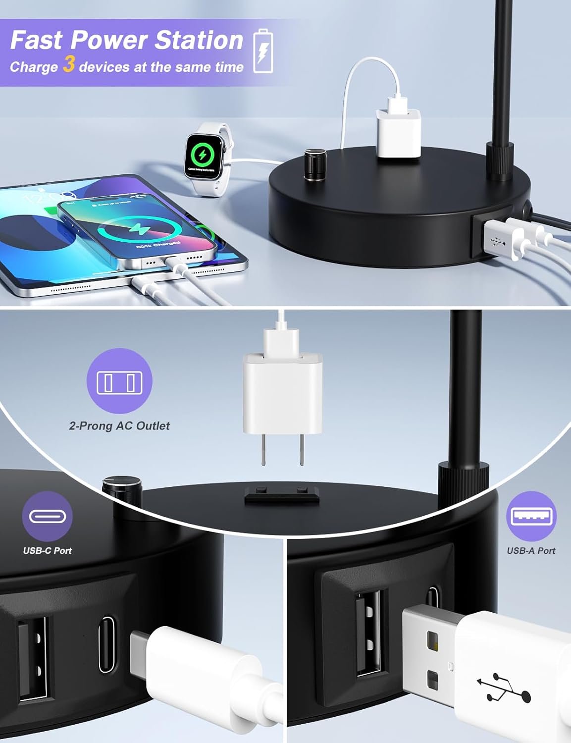 【Table Lamp with Usb Port and Outlet】Transform your bedside into a clutter-free charging station with dual USB-C/A ports + built-in AC outlet.The small lamp could charge up your phone, tablet, AND laptop simultaneously whether the lamp is on or off.