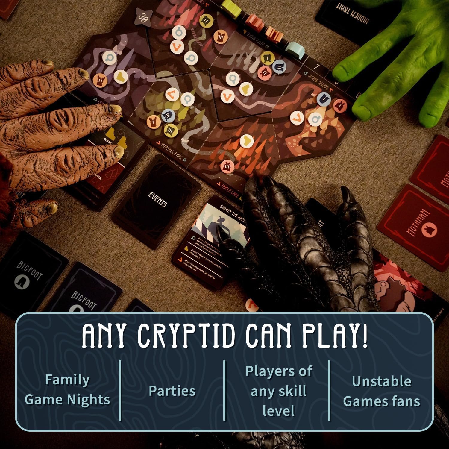 Take-That Mechanics: Outwit opponents in just 60 minutes using hidden trait cards, Cryptid meeples, and take-that mechanics. A great addition to your collection of strategy board games with dynamic, competitive gameplay.