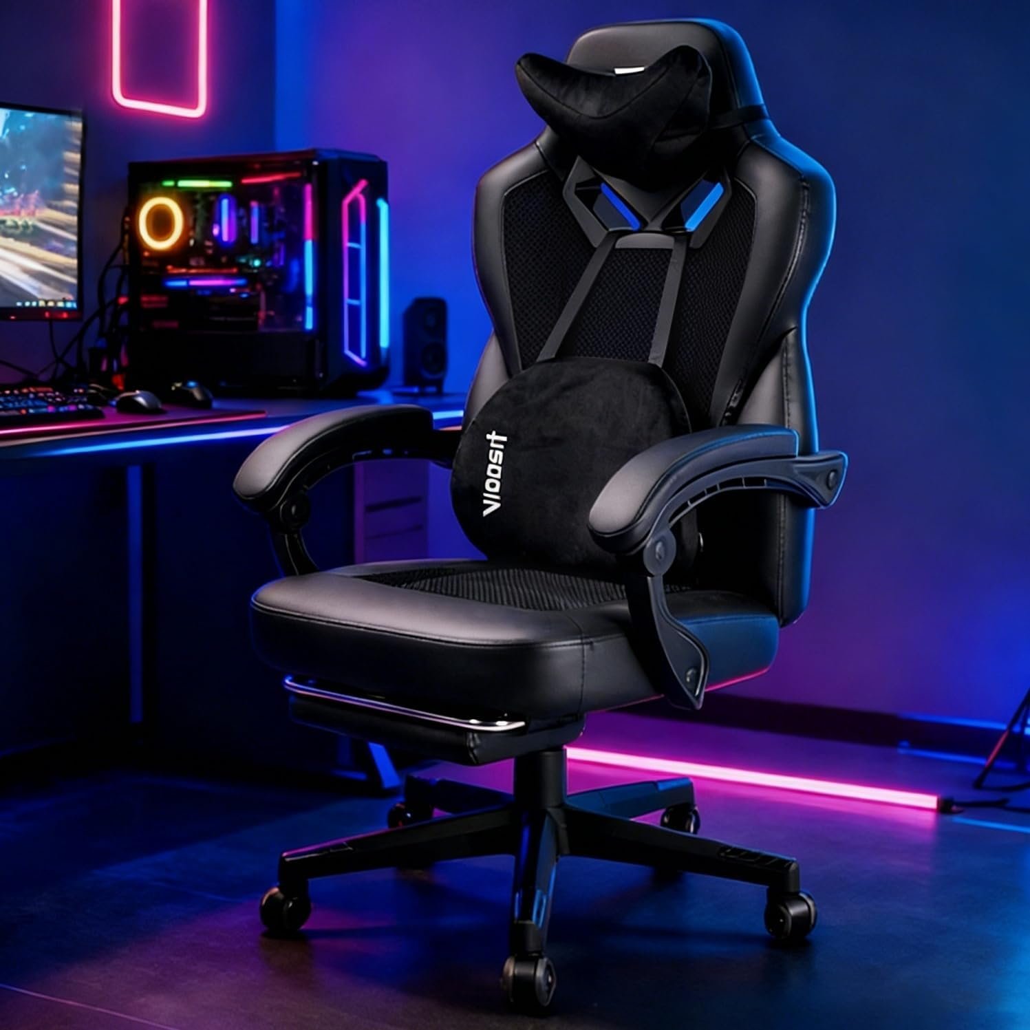 【COMFORTABLE GAMING CHAIR】Frame made of FSC-Certified wood. Vigosit gamer chair is made of PU leather and mesh fabric splicing, taking into account comfort and breathability, preventing heat and moisture from causing discomfort, giving you a refreshing feeling without sweating. Heavy duty gaming chair for adult has a wide muscle-shaped back, combined with ergonomic curve design, can fit perfectly without squeezing feeling, bringing a great sitting experience.