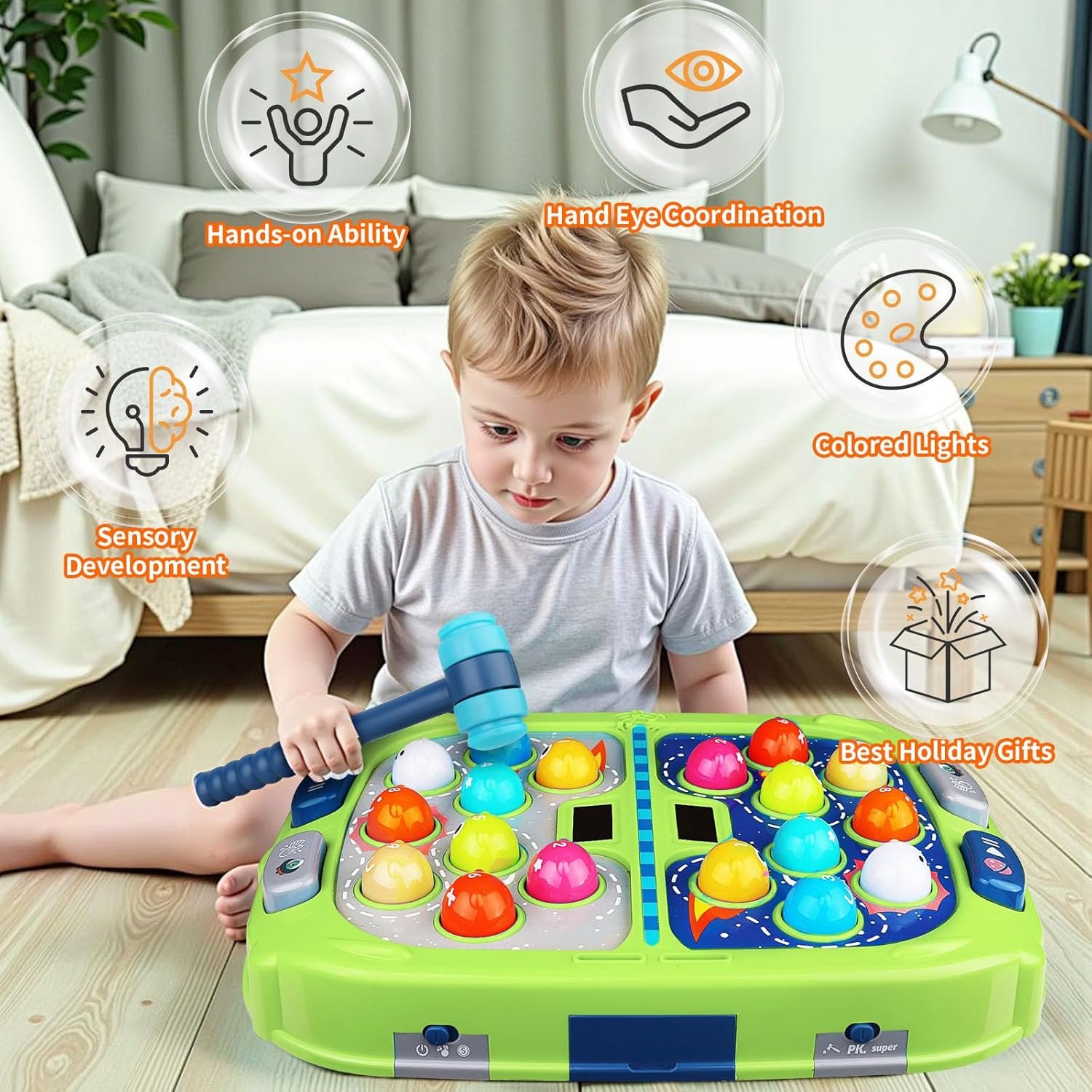 Developmental Fun & Friendly Competition: More than just thrills, it builds essential skills! Whacking targets hones fine motor skills, hand-eye coordination, brain development, cooperation, focus and reaction time.Designed for toys for ages 5-7 girls and boys, it encourages healthy competition with friends or parents using the two included soft-tip hammers.