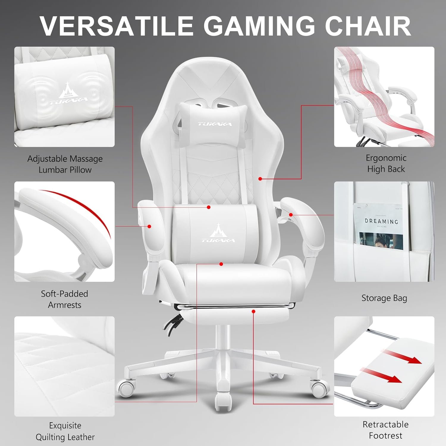 【Multifunctional and Versatile】Perfect for both gaming and office scenes.The gaming chair features 90 ° to 140° reclining backrest and the retractable footrest allowing you to recline or take a nap comfortably.Versatile footrest can be also used in sitting cross-legged.Smooth 360 ° swivel and chair 4” seat height adjustable for flexibility.Adjustable massage lumbar for optimal support. The headrest can be placed at the hollow or the top .360°smooth&silent wheels for all types of floor.