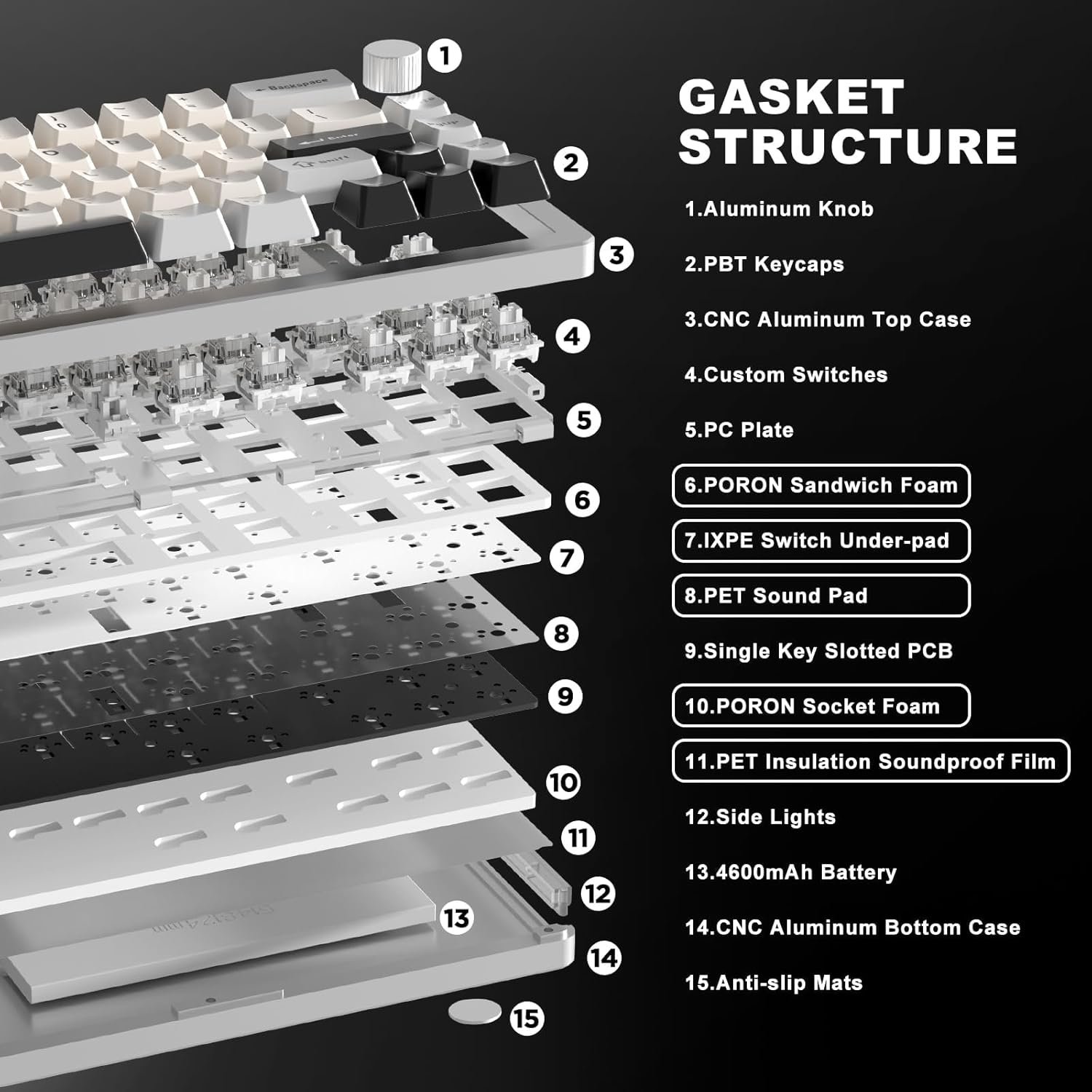 Hot Swap Linear Milk Switch:YUNZII AL66 wireless mechanical keyboard utilizes a premium gasket material for solid typing sound. The hot swappable mechanical keyboard supports 3-pin or 5-pin mechanical switches.Equipped with poron sandwich foam, poron socket foam, PET sound pads, pre lubed swicthes and stabilizers,the keyboard provides pleasant typing feeling, ideal for gamers who like custom keyboard with superb quality